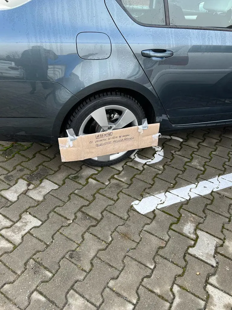 Un șofer a șocat opinia publică, în special pe proprietarii de animale de companie, cu un carton pe care l-a fixat pe roțile mașinii.