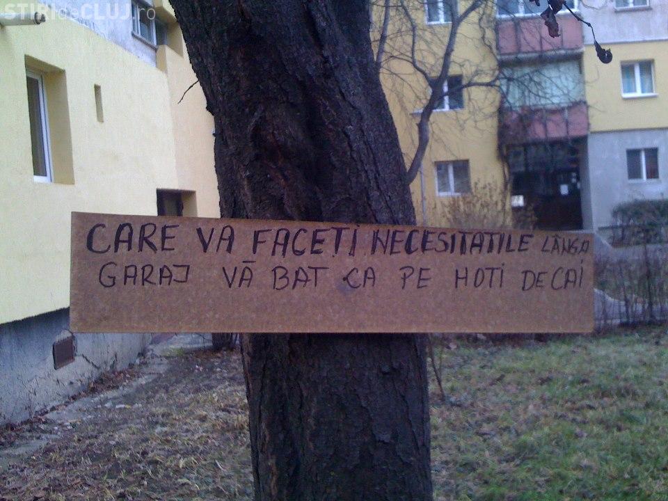 ”Care vă faceți necesitățile lângă garaj, vă bat ca pe hoții de cai!”, a scris bărbatul pe un panou amplasat lângă garaj.