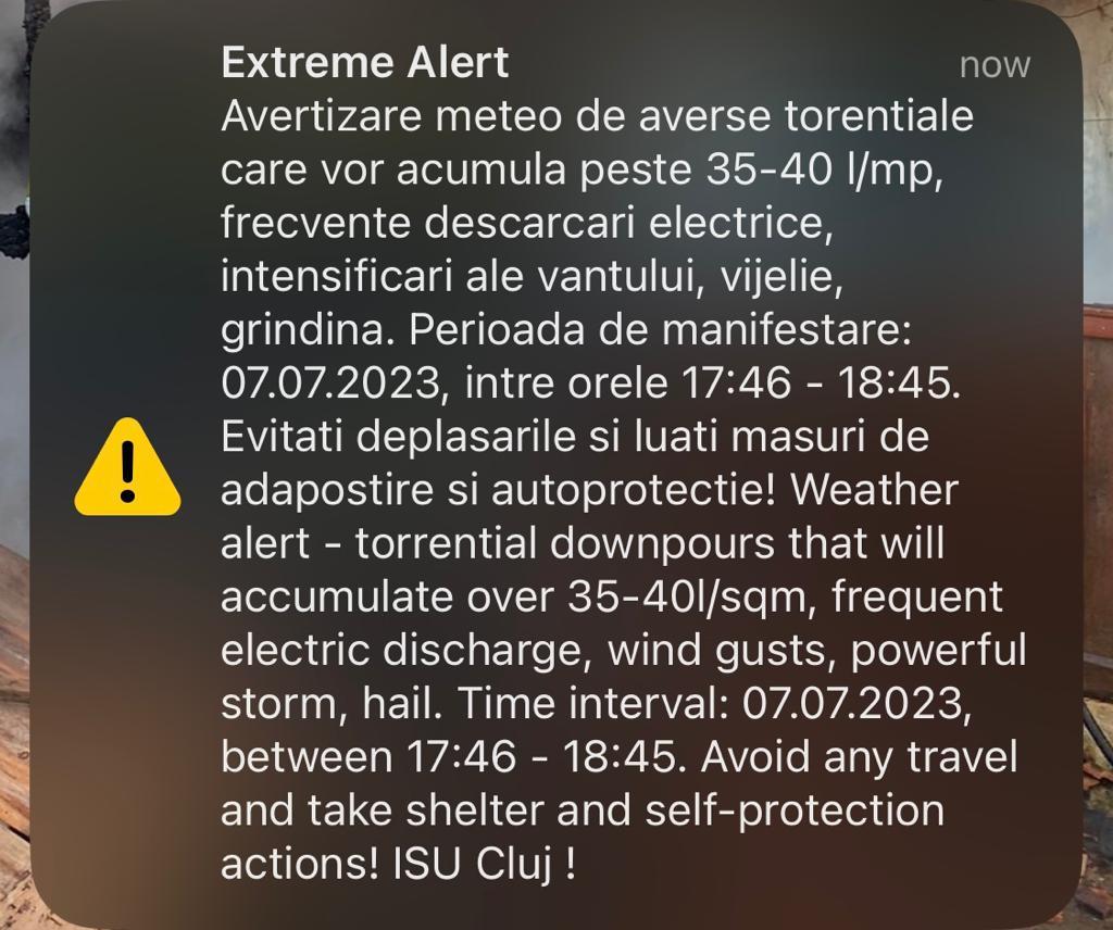 ISU Cluj a trimis un mesah Ro-Alert de furtuni puternice în Cluj-Napoca.