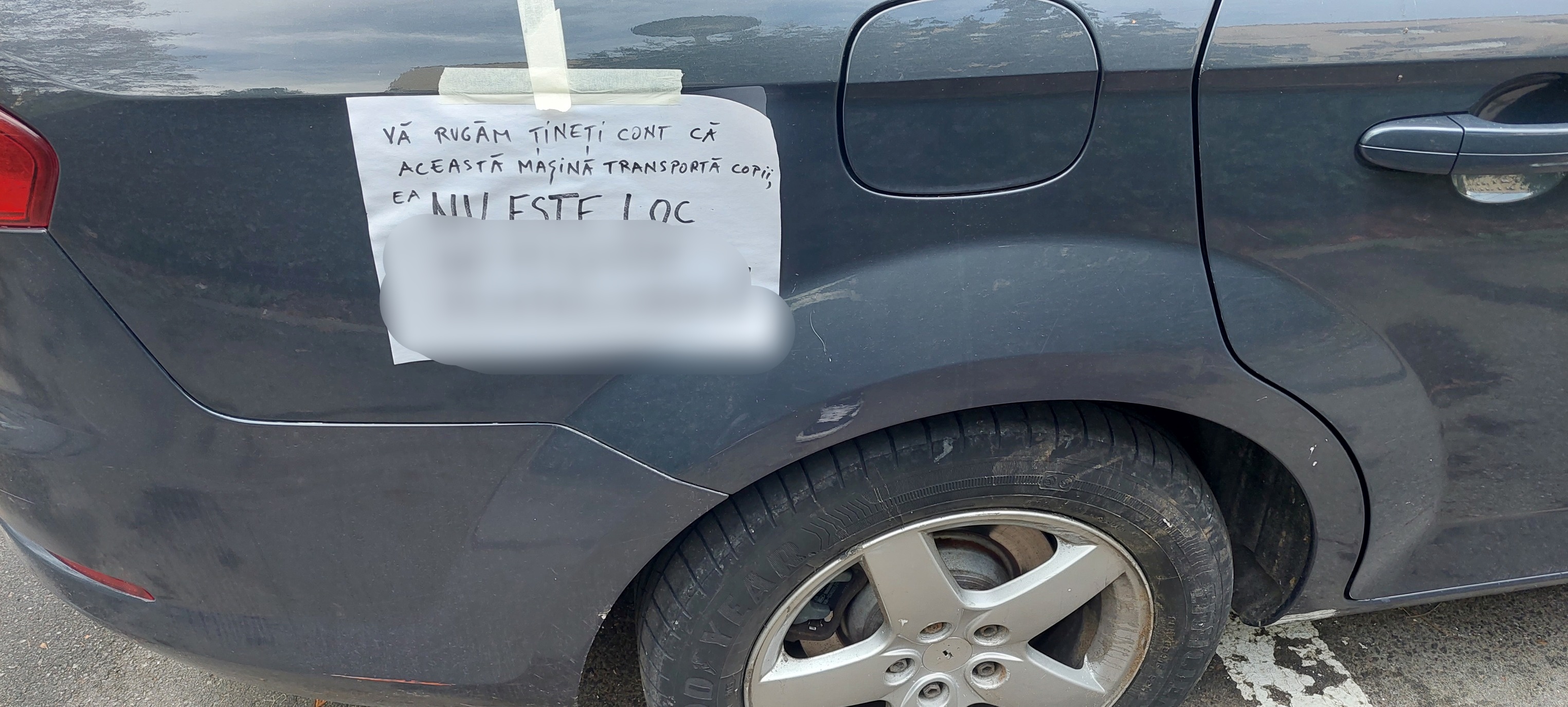 ”Vă rugăm țineți cont că această mașină transportă copii, ea Nu este loc de pișare pentru câini!”, se arată în anunț.