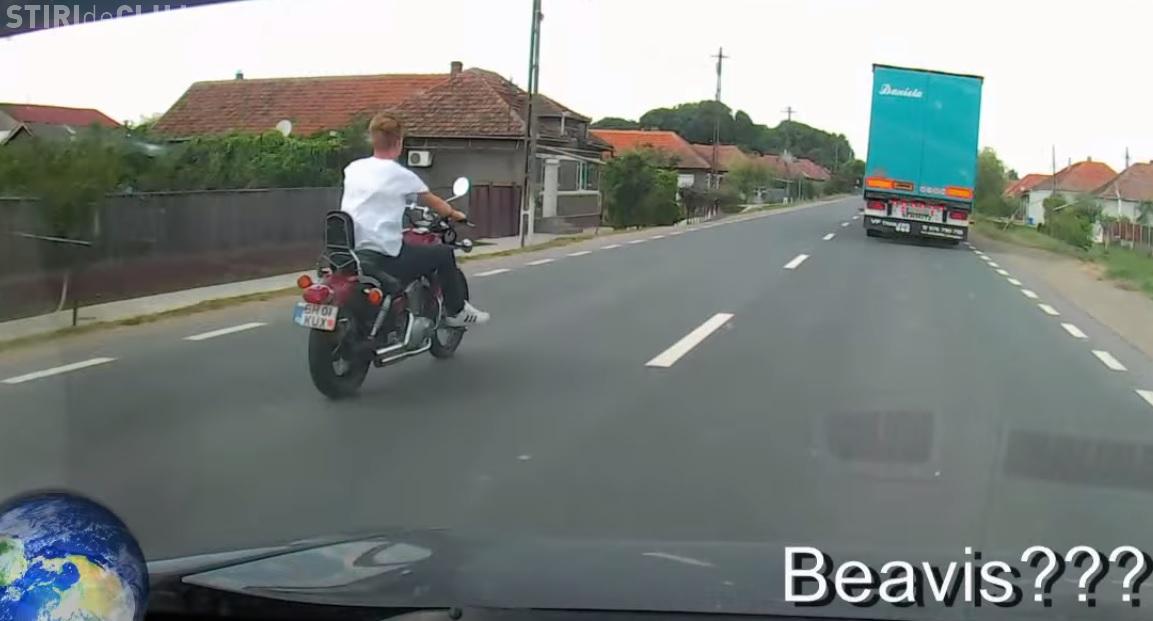Meseriașii șoselelor la Cluj! Motociclistul fără cască ce se crede Beavis - VIDEO