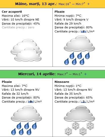 În intervalul 12 - 15 aprilie, vremea se va răci treptat, așa încât valorile termice vor ajunge mult mai scăzute decât cele normale în a doua decadă a lunii aprilie, cu medii ale maximelor de 6 - 7 grade şi ale minimelor de -1 la 0 grade. Încălzirea vremii din 16 - 19 aprilie va apropia regimul termic de normalul perioadei prin valori medii ale temperaturilor maxime de 14 - 15 grade şi ale temperaturilor minime de 1 - 2 grade. Ulterior, până la sfârşitul celei de-a doua săptămâni de prognoză, nu sunt estimate oscilaţii termice importante pe fondul răcoros al vremii, astfel că se vor înregistra, în medie, maxime de 13 - 15 grade și minime de 2 - 3 grade. Pe tot parcursul intervalului de prognoză, probabilitatea pentru precipitații va fi ridicată.