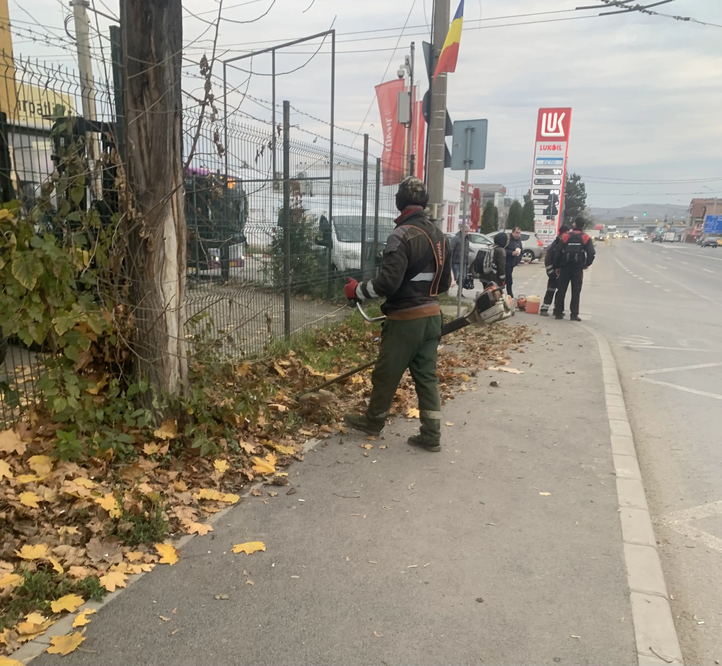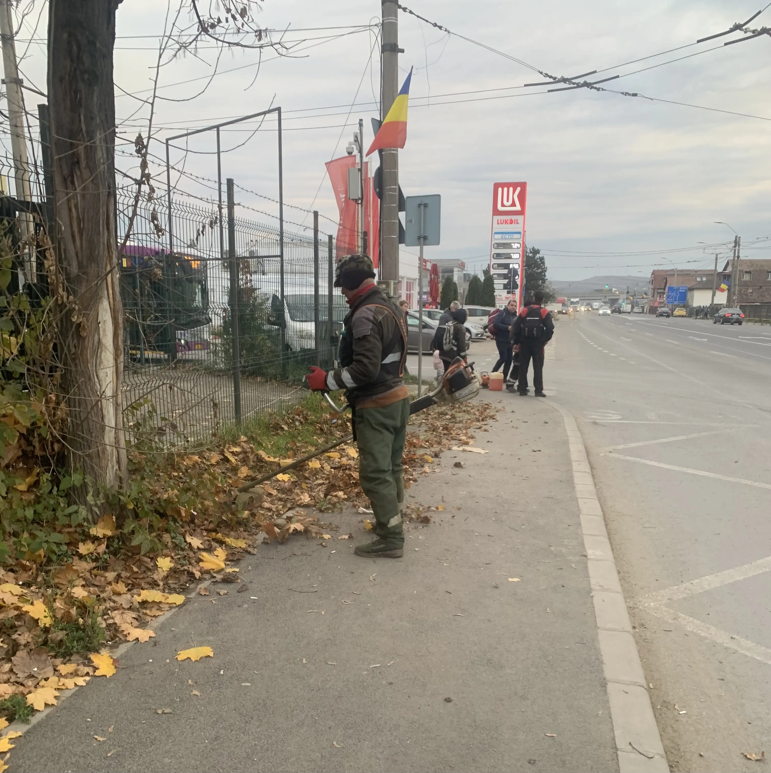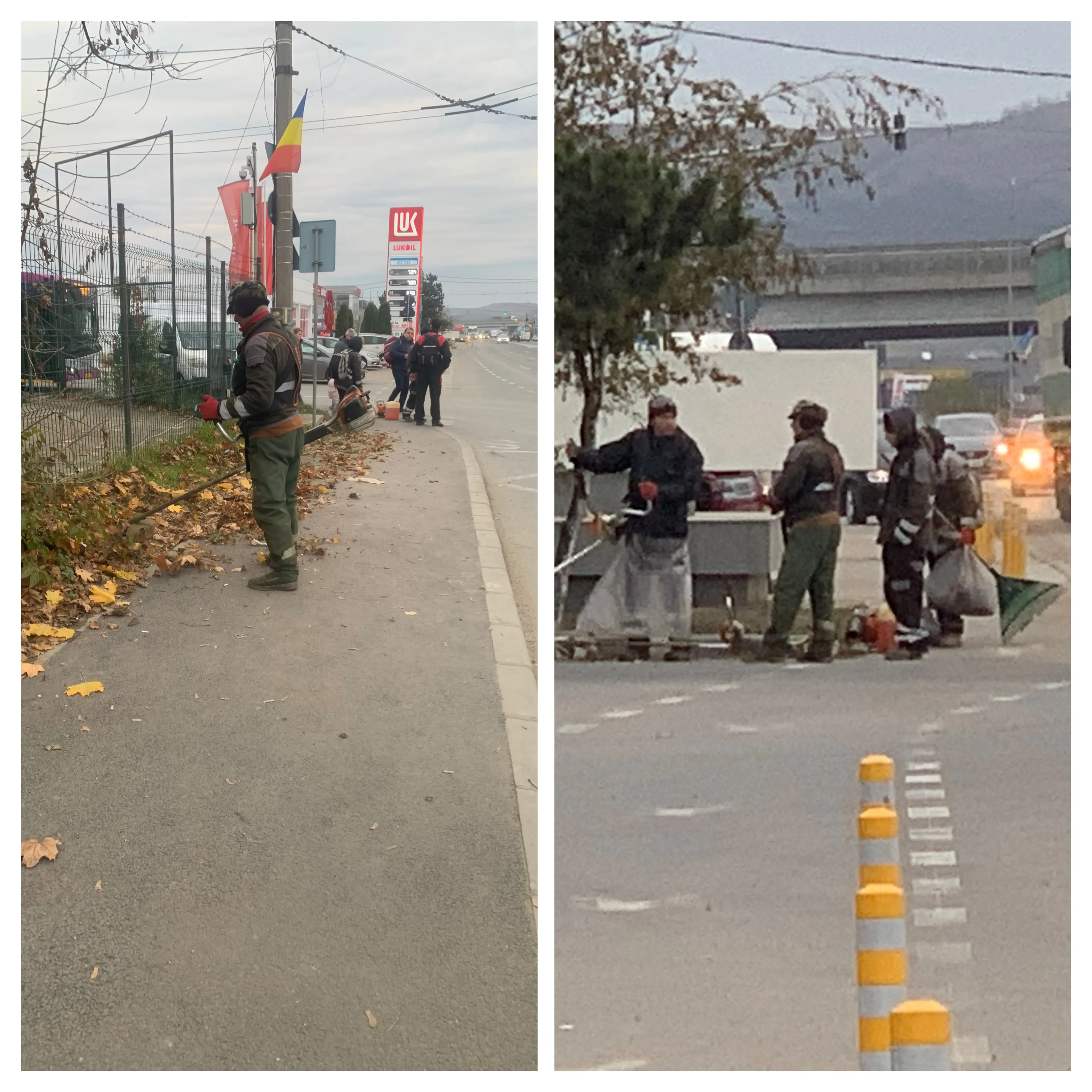 Angajații firmei Eco Garden au fost surprinși, vineri dimineață, la ieșire din Cluj-Napoca spre Apahida, în timp ce tundeau iarba care nu mai crește de aproape două luni fiind sezon rece.
