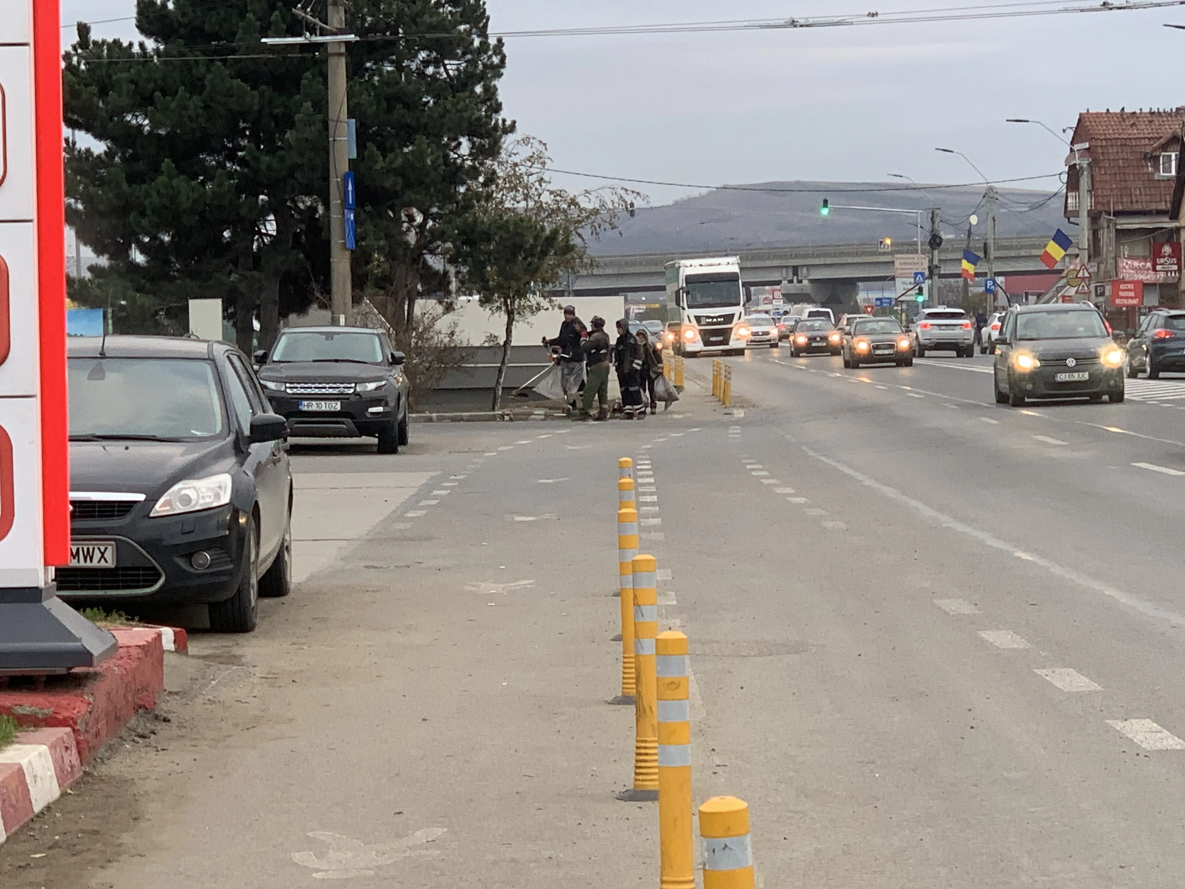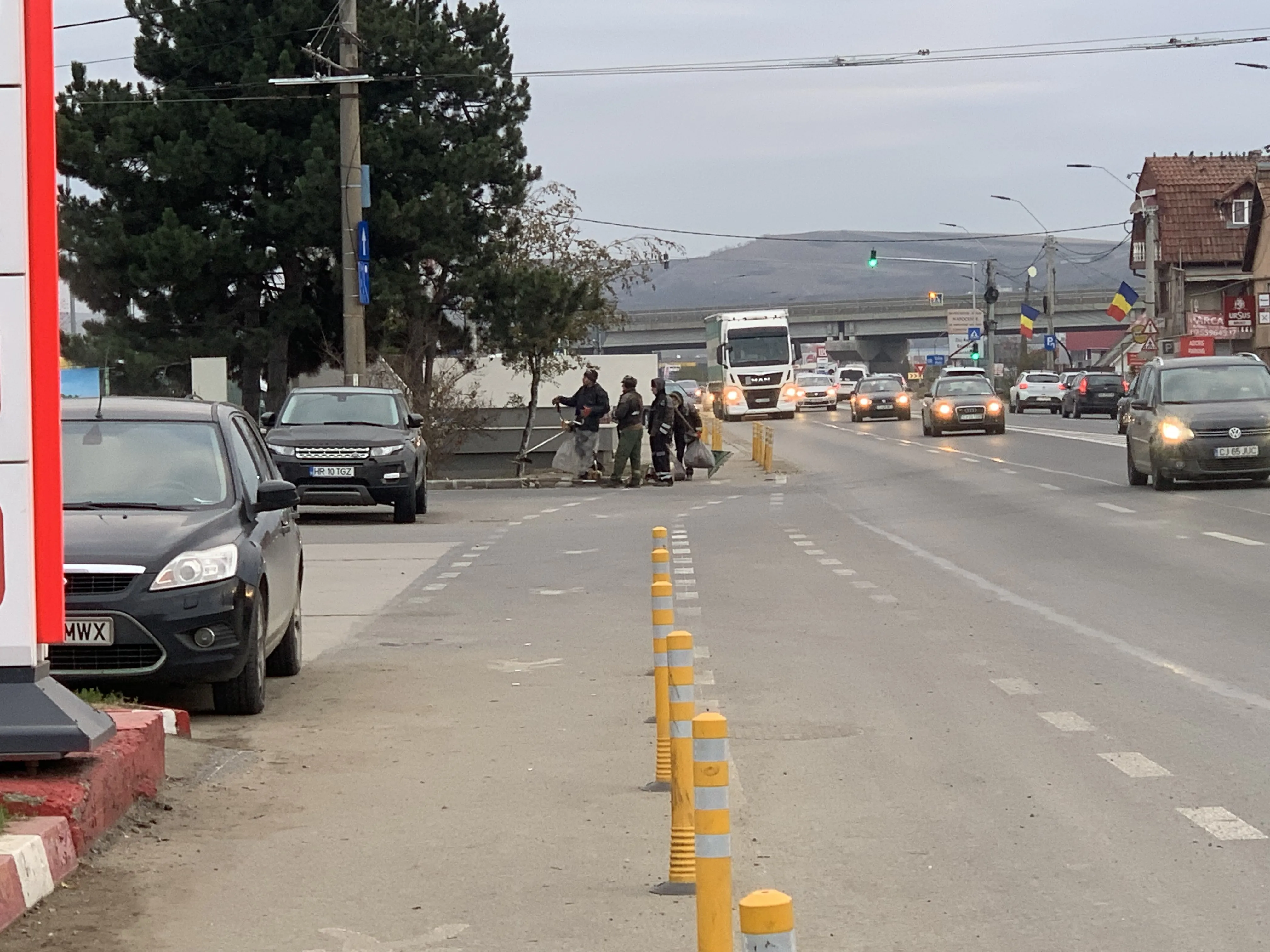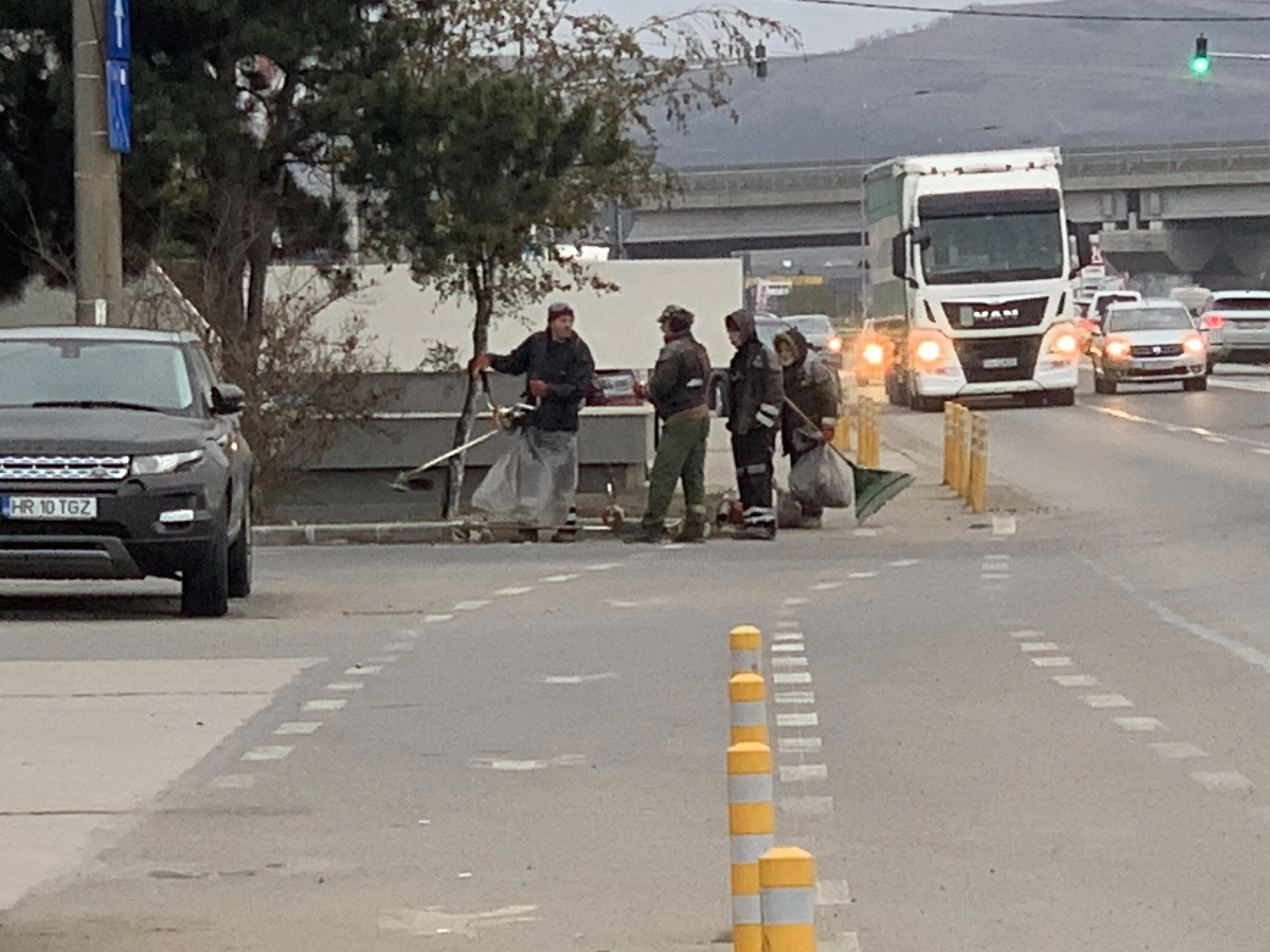 Angajații firmei Eco Garden au fost surprinși, vineri dimineață, la ieșire din Cluj-Napoca spre Apahida, în timp ce tundeau iarba care nu mai crește de aproape două luni fiind sezon rece.