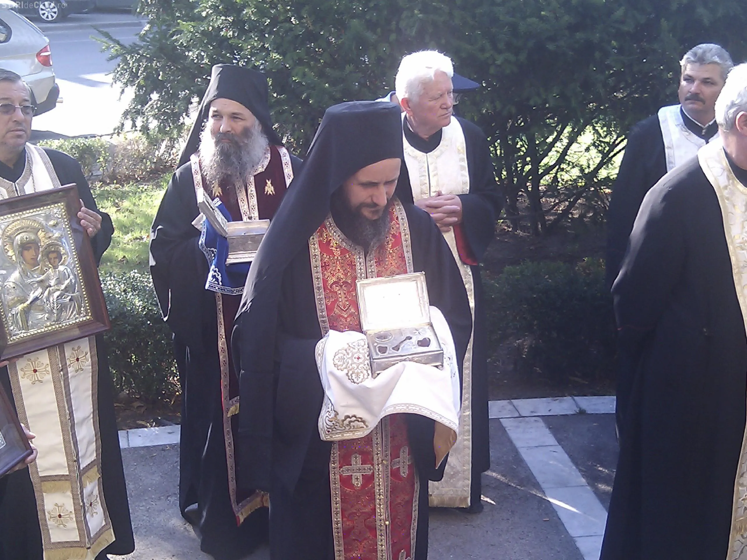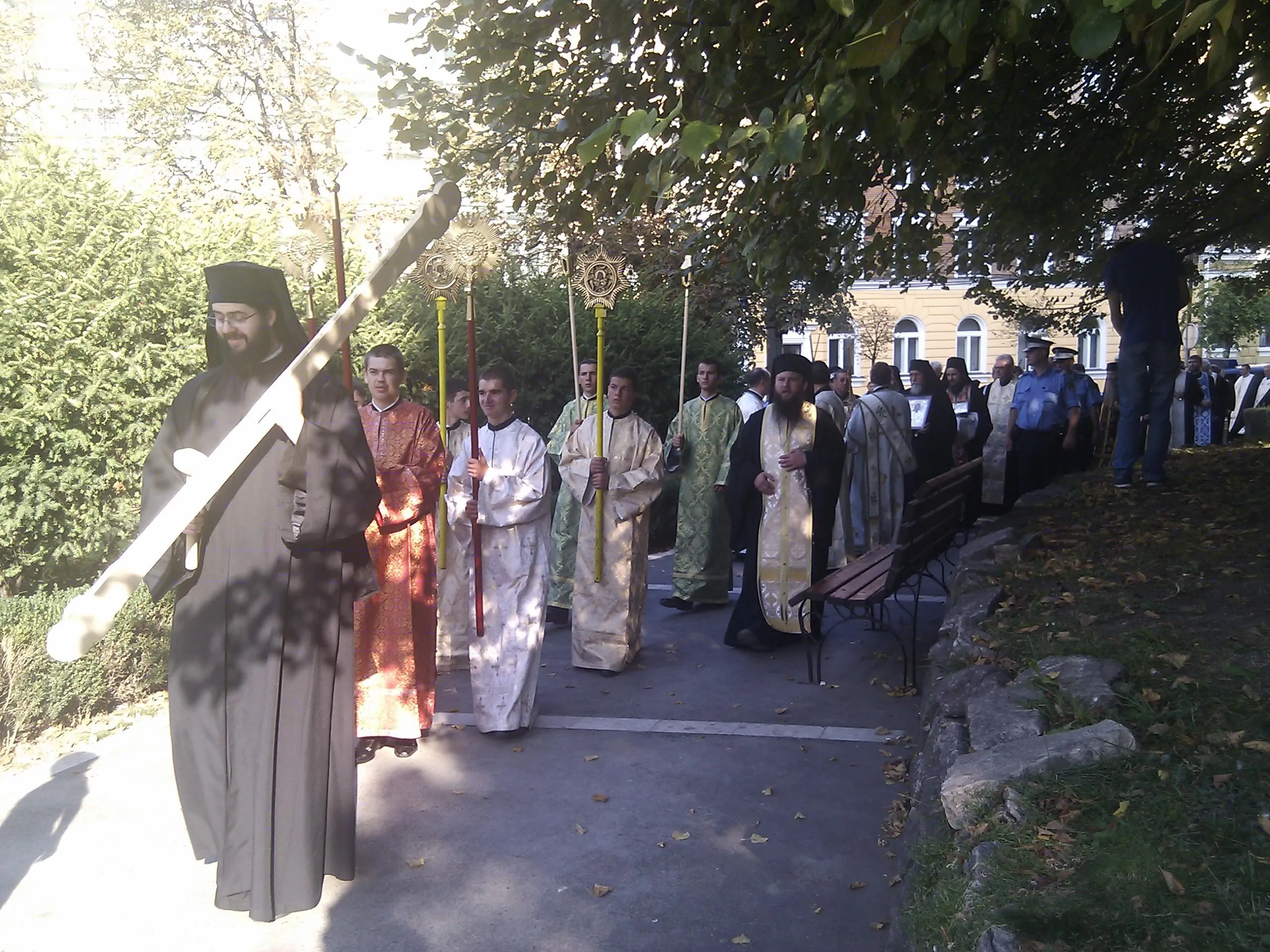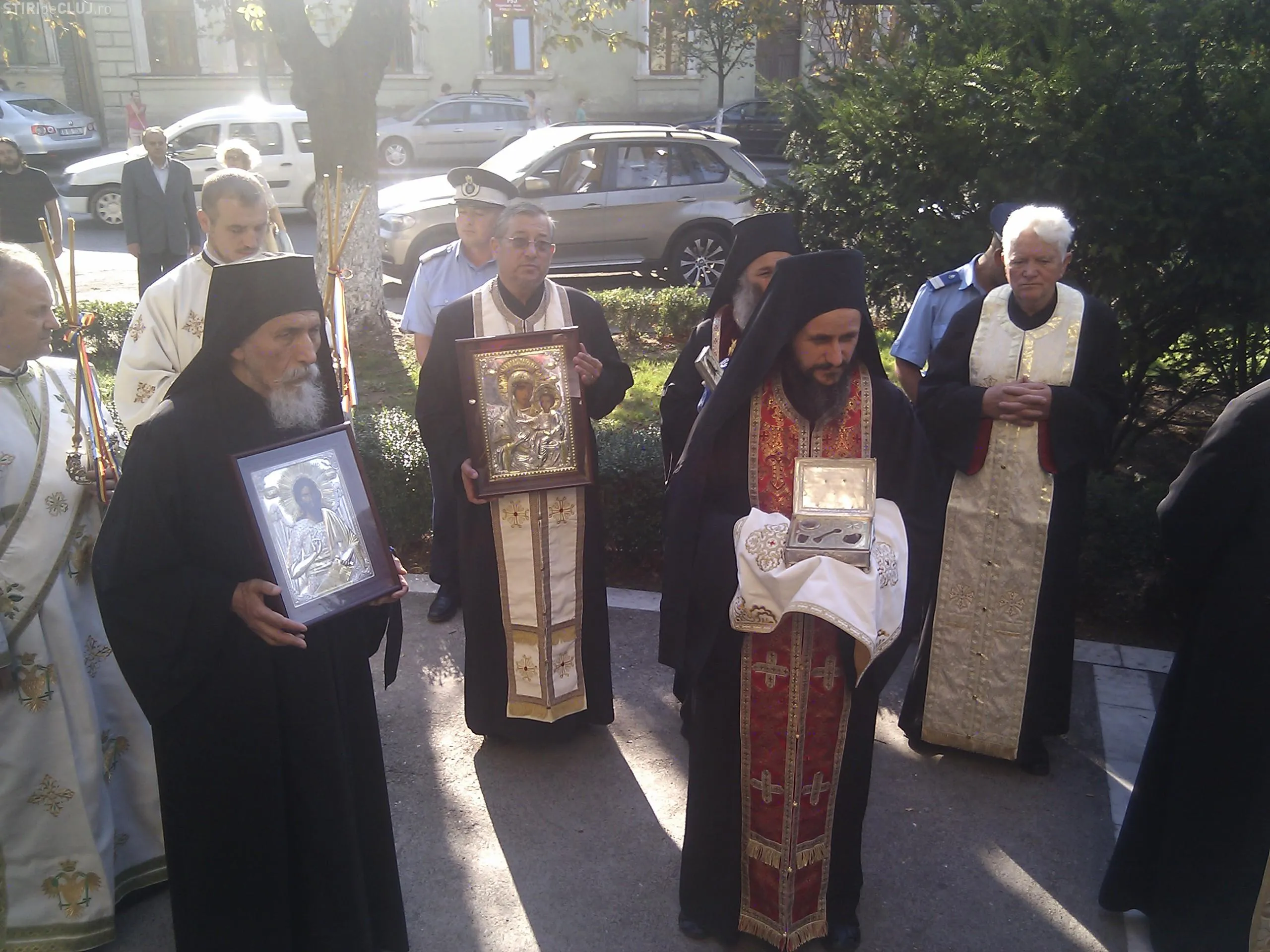 Sfintele moaste au fost duse din curtea Palatului Mitropolitan la catedrala, pe care preotii au inconjurat-o impreuna cu credinciosii.