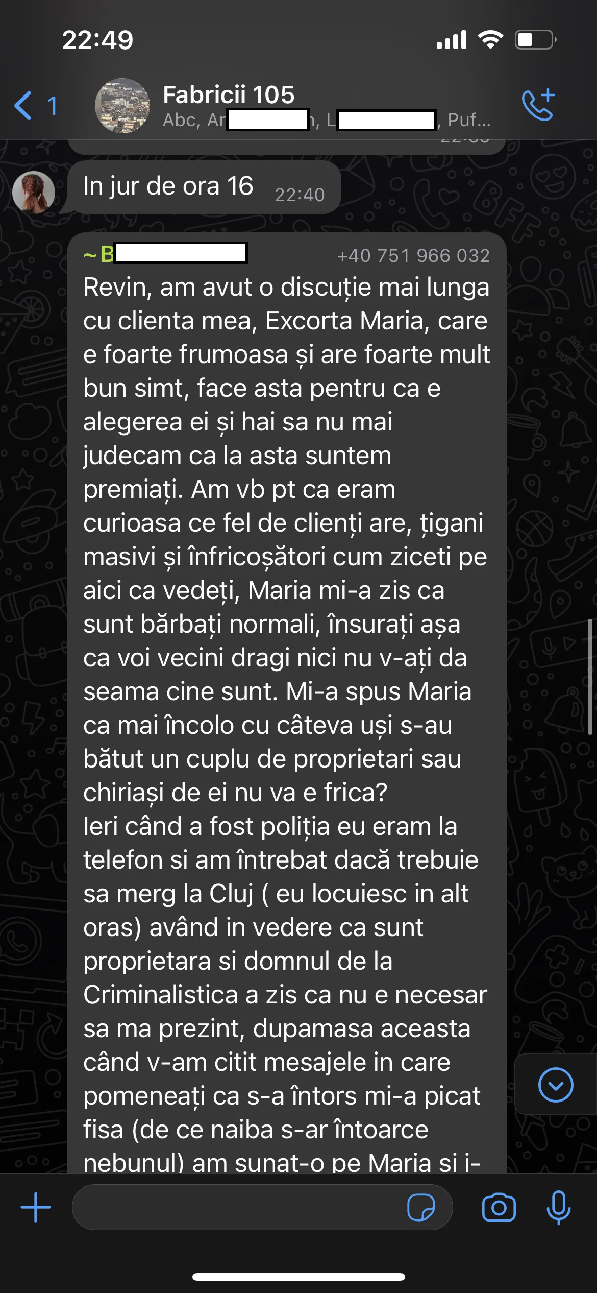Proprietara apartamentului a fost contactată de poliție și a ținut să reacționeze pe grupul de Whatsapp al imobilului, unde vecinii erau tensionați.