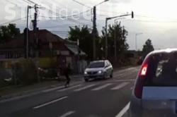 Cu toate că mașinile din sens opus s-au oprit la culoarea roșie a semaforului, un șofer a vrut să treacă pe roșu, dar o femeie tocmai încerca să traverseze strada. Din fericire, aceasta a apucat să vadă că autoturismul nu se oprește și a apucat să fugă, evitând impactul.