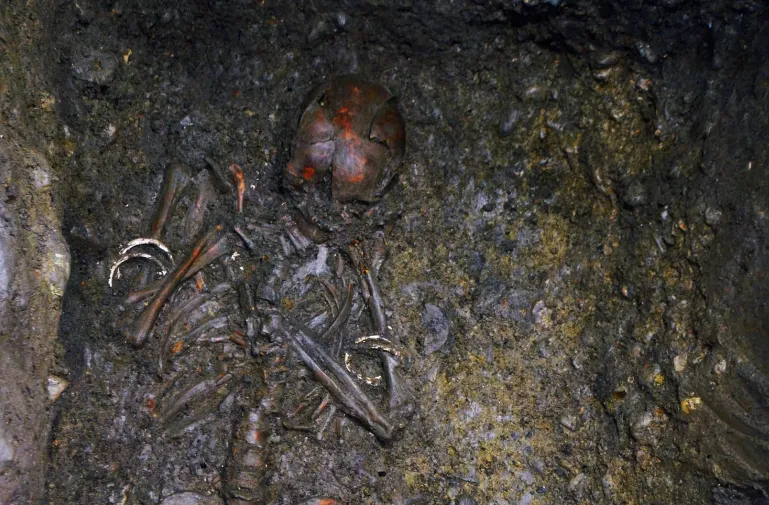 Inițial, a fost surprins doar un capăt de-al său, în care au apărut falangele picioarelor și ofranda de vase. Chiar și așa, descoperirea se anunța a fi deosebită, gleznele scheletului părând a fi înfășurate în șiraguri formate din sute de mărgele de mici dimensiuni.