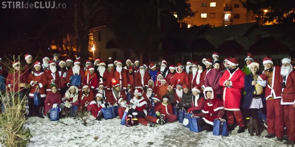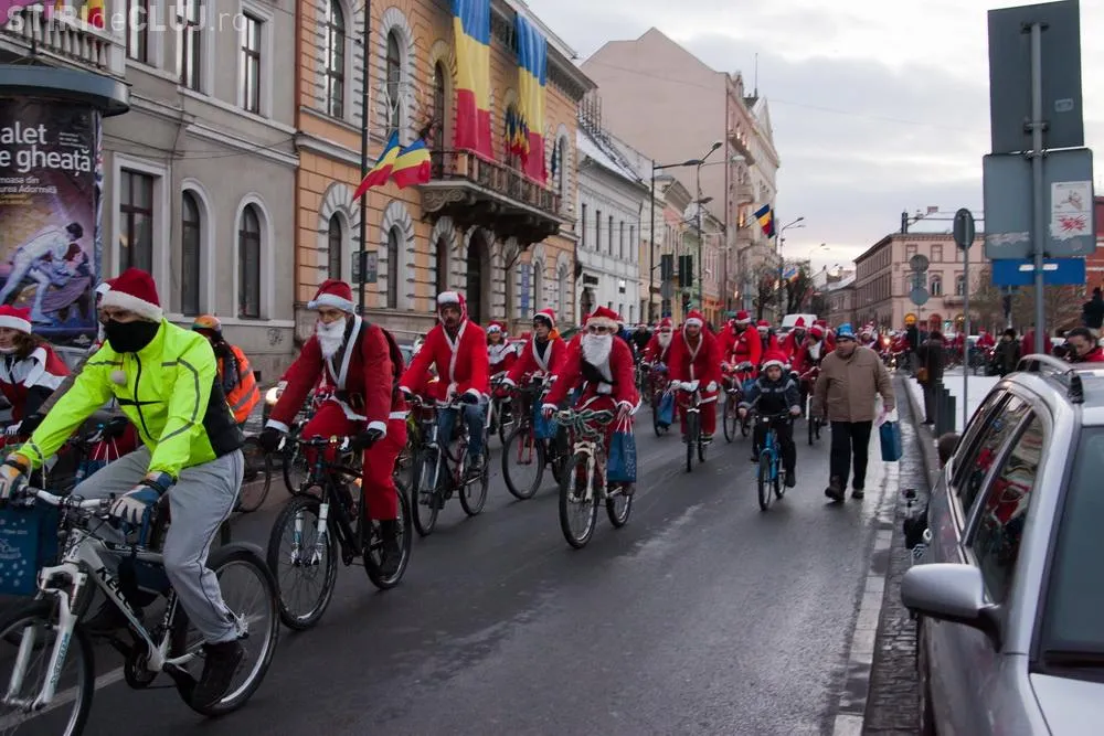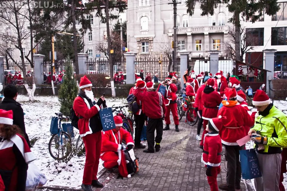 Circa 150 de bicicliști costumați în Moș Crăciun au participat, duminică, la un marș prin Cluj-Napoca, oprindu-se la copiiide la două licee pentru a le lăsa cadouri.