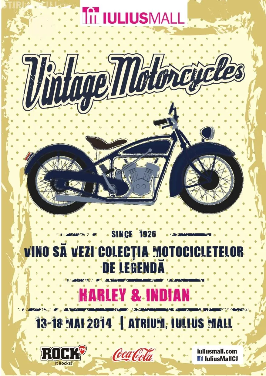 ”Vintage Motorcycles” este un eveniment organizat de Iulius Mall Cluj, care va aduce în atenţia publicului adevărate bijuterii pe două roţi, îndrăgite de bikeri din întreaga lume. Clujenii vor putea admira motociclete rare marca Indian şi Harley-Davidson, modele inestimabile ca valoare şi cu poveşti care au făcut înconjurul mapamondului. Aproape fiecare deceniu al secolului trecut va fi reprezentat de câte un model de excepţie, care se evidenţiază prin tehnologia folosită, componente, design şi elemente grafice.