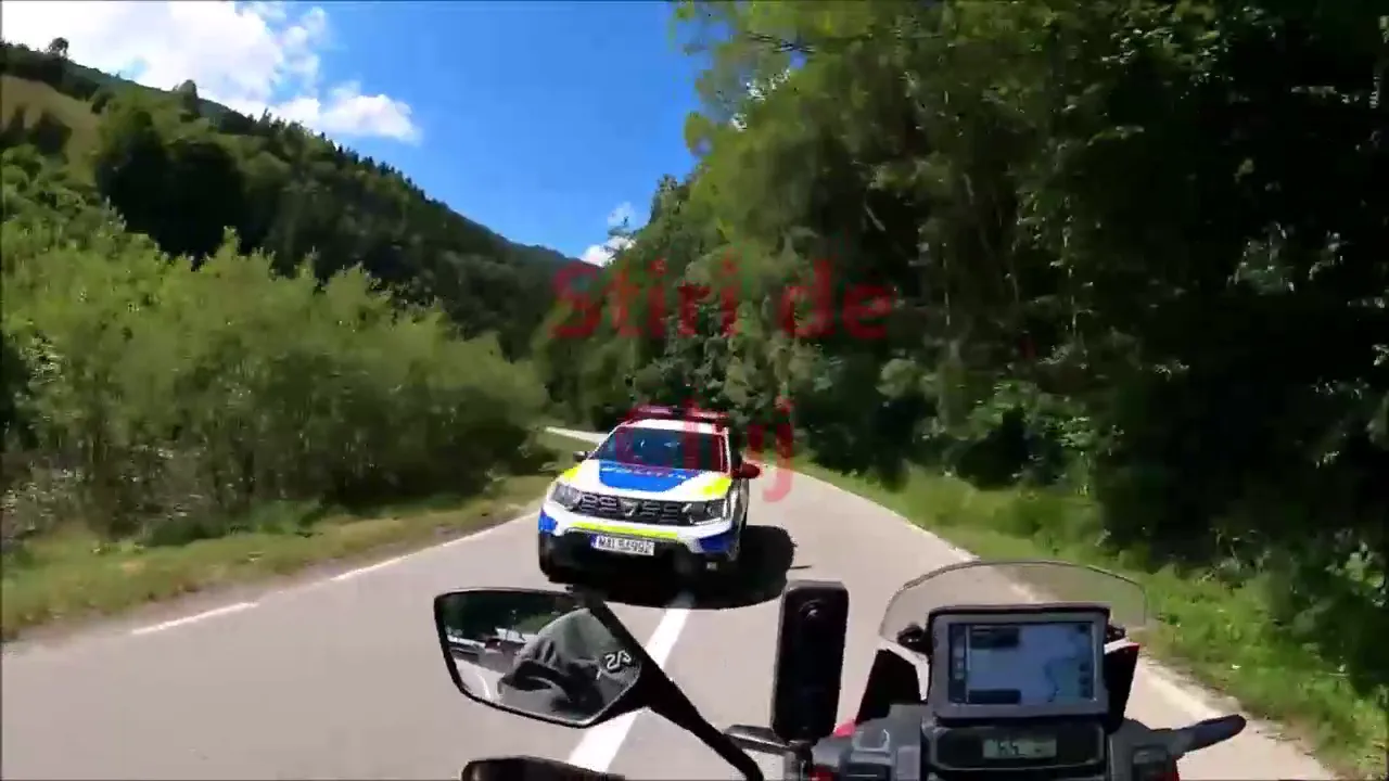 Un motociclist german a fost la un pas să fie spulberat de o mașină de poliție pe drumul de la Cluj spre Oradea. Prezența de spirit a bikerului i-a salvat probabil viața. Acesta a tras rapid dreapta și a evitat coliziunea.