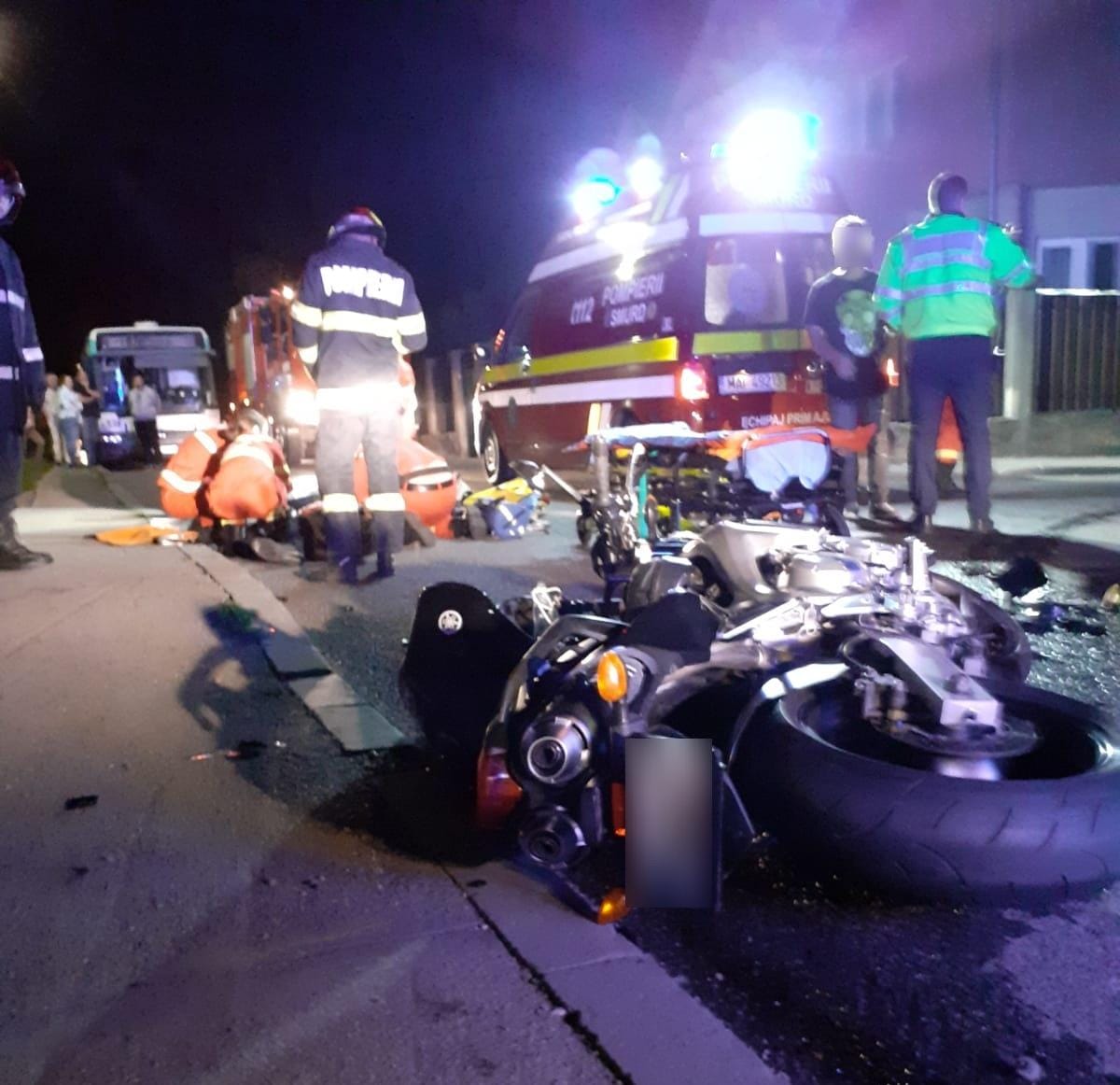 Pompierii sosiți la fața locului au găsit un autoturism și o motocicletă avariate și doi tineri întinși pe jos, în stare de conștiență, cooperanți, dar care suferiseră traumatisme multiple.