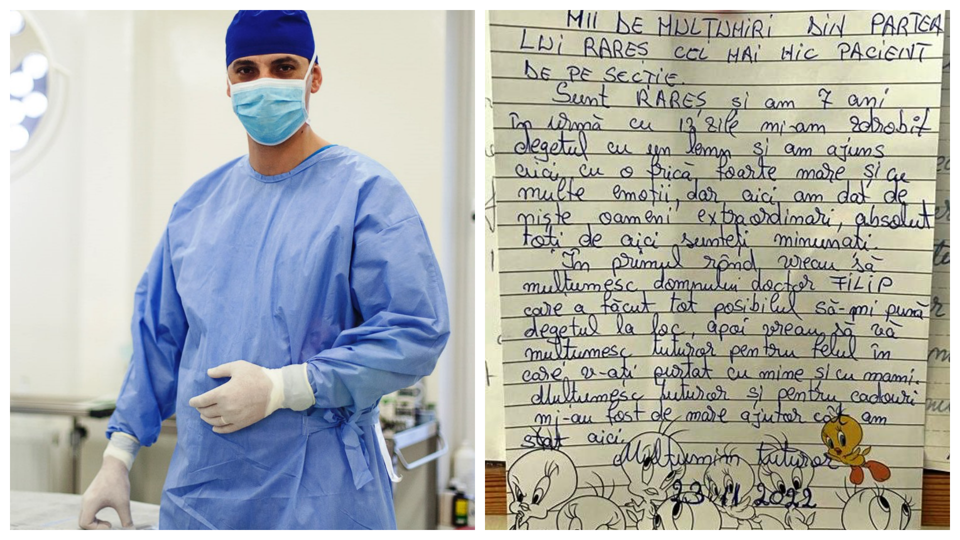 Sunt Rareș și am 7 ani. În urmă cu 13 zile mi-am zdrobit degetul cu un lemn și am ajuns aici cu o frică foarte mare și cu multe emoții, dar aici am dat de niște oameni extraordinari, absolut toți de aici sunteți minunați. În primul rând vreau să mulțumesc domnului doctor Filip care a făcut tot posibilul să-mi pună degetul la loc, apoi vreau să vă mulțumesc pentru felul în care v-ați purtat cu mine și cu mami. Mulțumesc tuturor și pentru cadouri, mi-au fost de mare ajutor cât am stat aici. Mulțumim tuturor. - 23.11.2022”, se arată în scrisoarea micului pacient.