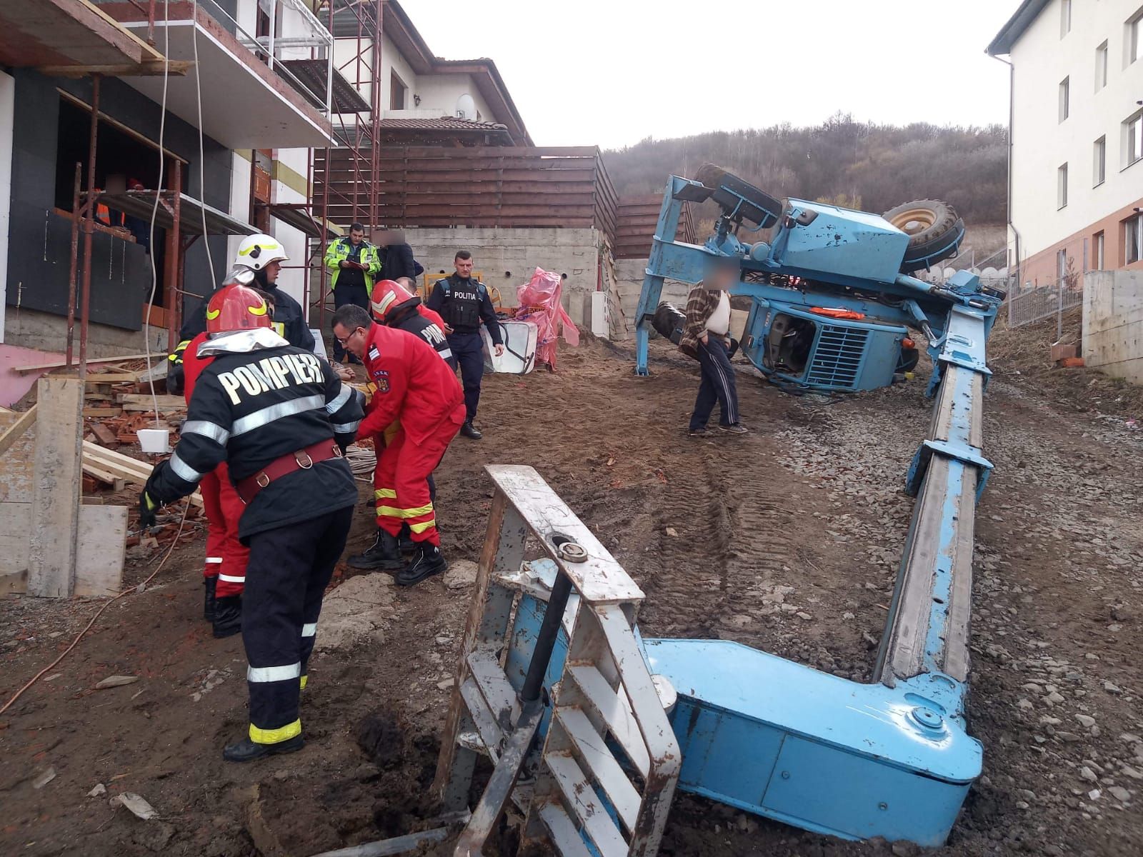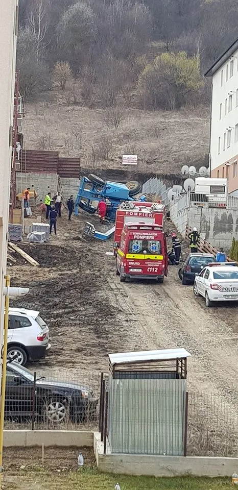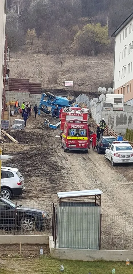 ISU Cluj anunță că: ”O autospecială cu modul de descarcerare și un echipaj SMURd au fost alertate, în jurul orei 12.10, ca urmare a răsturnării unei macarale, care ridica materiale de construcții pentru un bloc aflat în construcție, de pe strada Teilor din Florești.