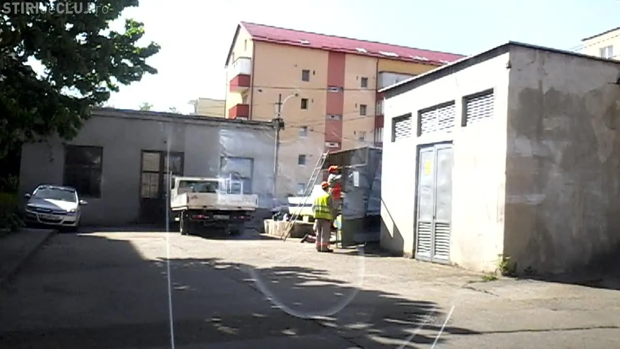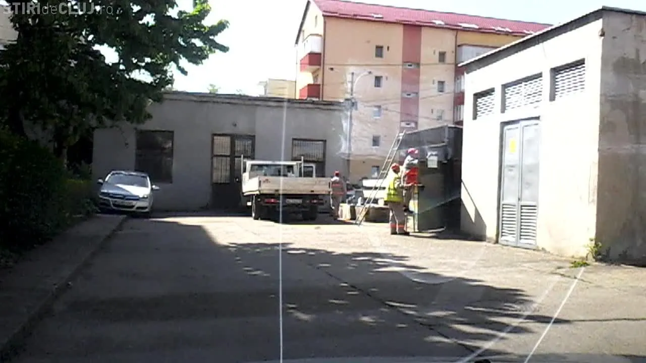 Muncitorii de la E.ON Gaz Cluj, costumați în salopetă și cu o autospecială de la serviciu, au fost filmați pe strada Anina din Cluj-Napoca, în timp ce vopseau și amenajau garajul unui director al societății.