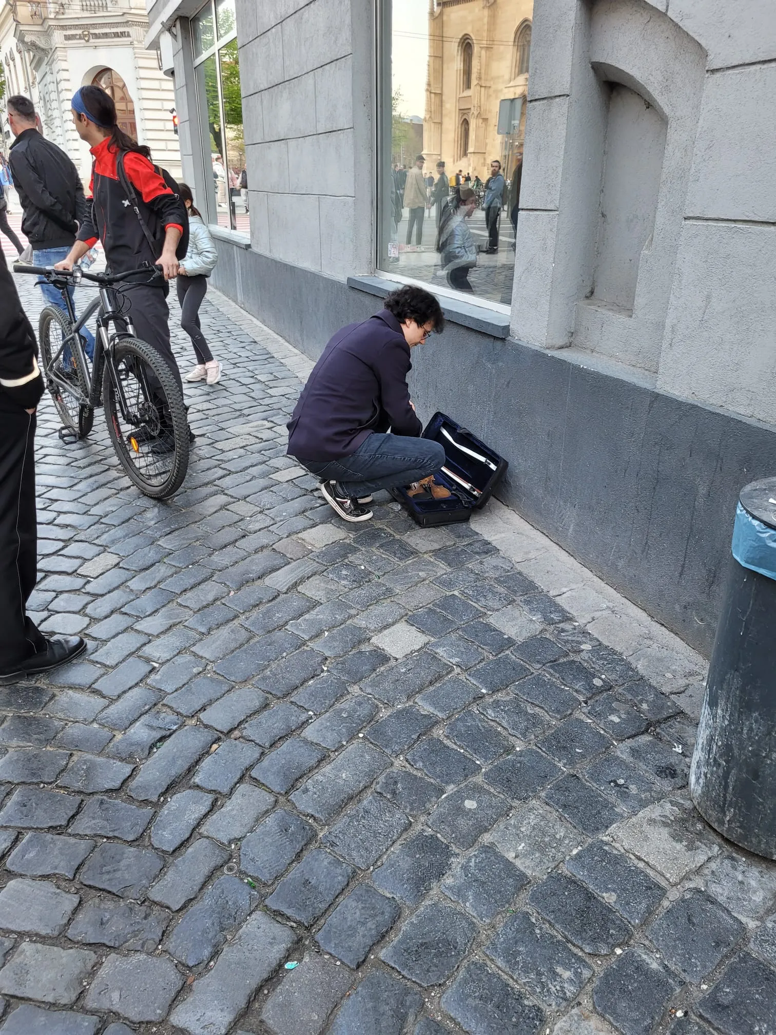 Un tânăr muzician care cânta pe strada Matei Corvin, în timp ce cânta pentru trecători. Scena a avut loc sâmbătă după-amiaza, iar muzicianul a trebuit să își adune lucrurile și să plece.