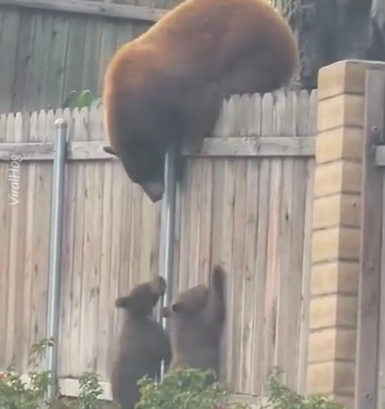 La un moment dat, în video apare mămica lor ce l-a „înșfăcat” pe unul dintre ei, trecându-l de cealaltă parte a gardului. Între timp, celalalt pui de urs continua să se cațere, sperând să ajungă în vârful gardului. Plictist fiind de încercarea repetată de a traversa gardul, puiul merge pe mijlocul șoselei, însă nu durează mult timp și ursoaica merge după el.