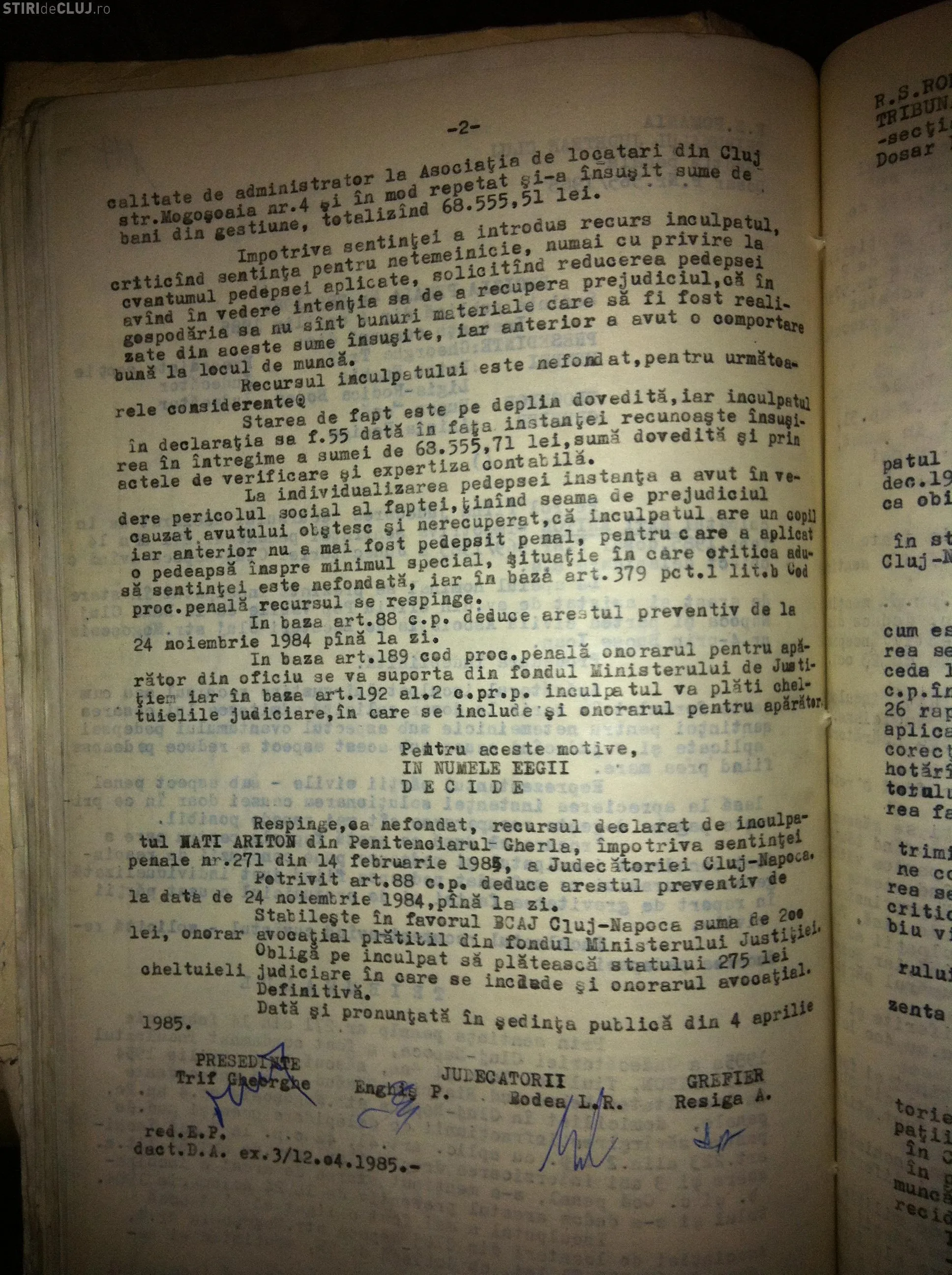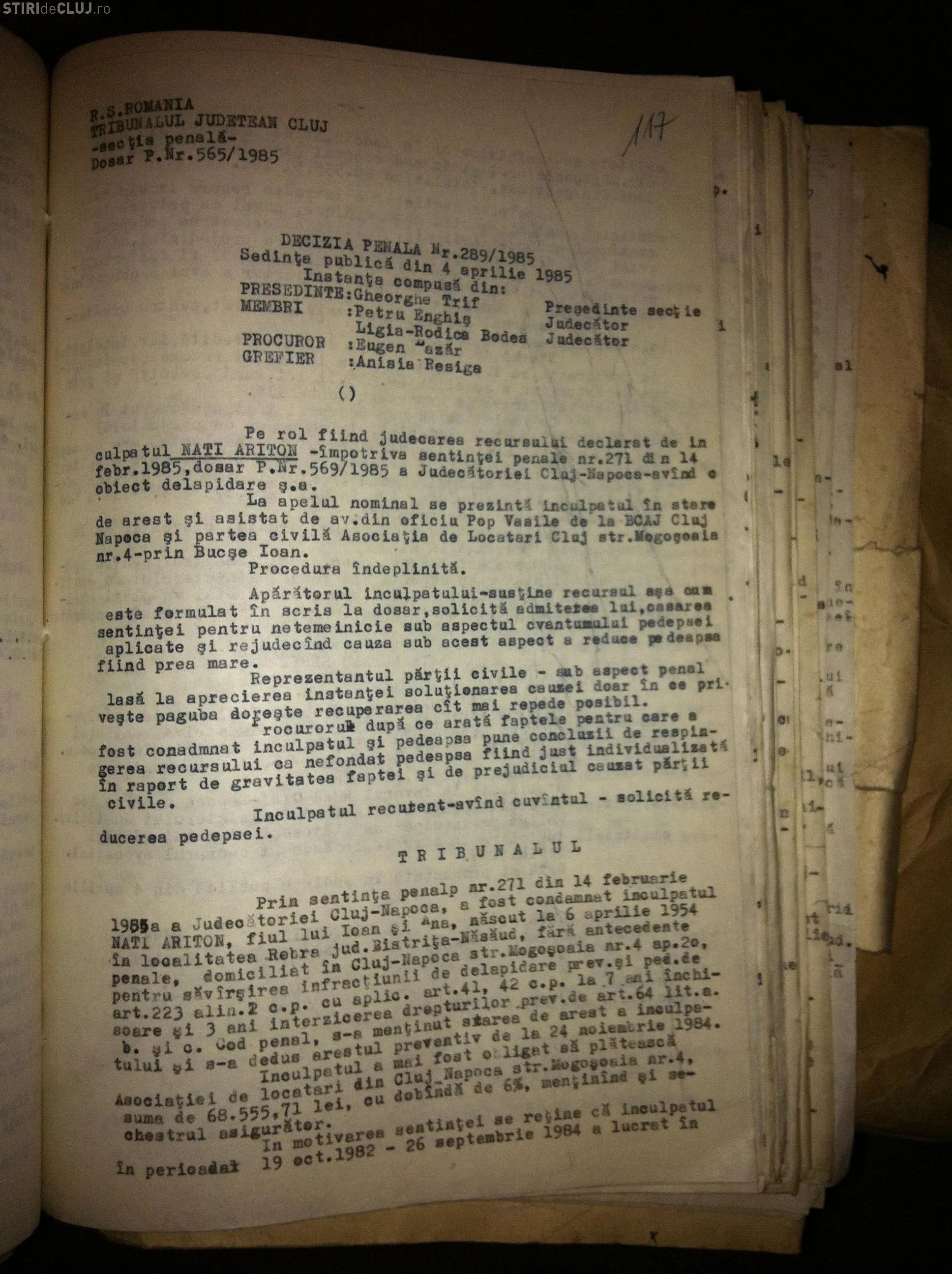 ”Nati Ariton a fost condamnat de Judecătoria Cluj-Napoca în 14 februarie 1985 la 7 ani de închisoare și 3 ani interzicerea unor drepturi pentru infracțiunea de delapidare.