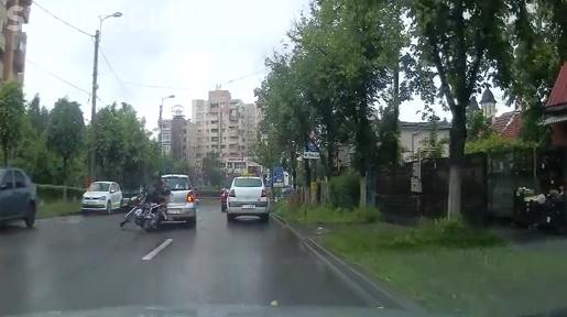Un astfel de incident a avut loc, marți, în cartierul Gheorgheni, unde un șofer grăbit a schimbat banda fără a mai semnaliza. Un motociclist care venea din spate nu a mai avut timp să pună frână, iar carosabilul fiind și umed, astfel că a intrat din plin în autoturism.