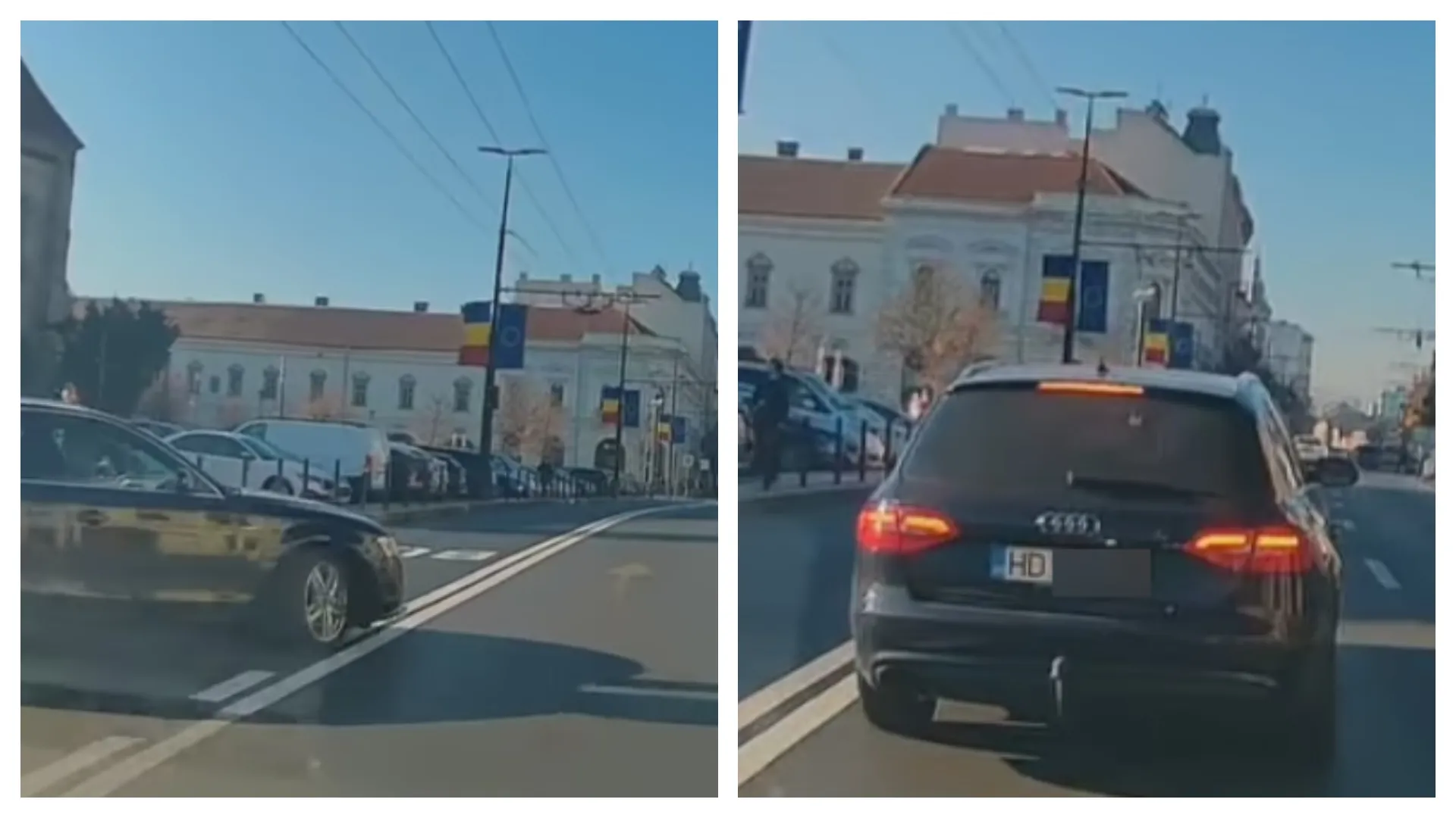 Un astfel de caz a fost surprins de camera de bord a unui participant la trafic. Mai exact, autoturismului care se deplasa regulamentar i-a fost tăiată calea de către un șofer, cu numere de Hunedoara, care ieșea din parcarea din Piața Unirii.