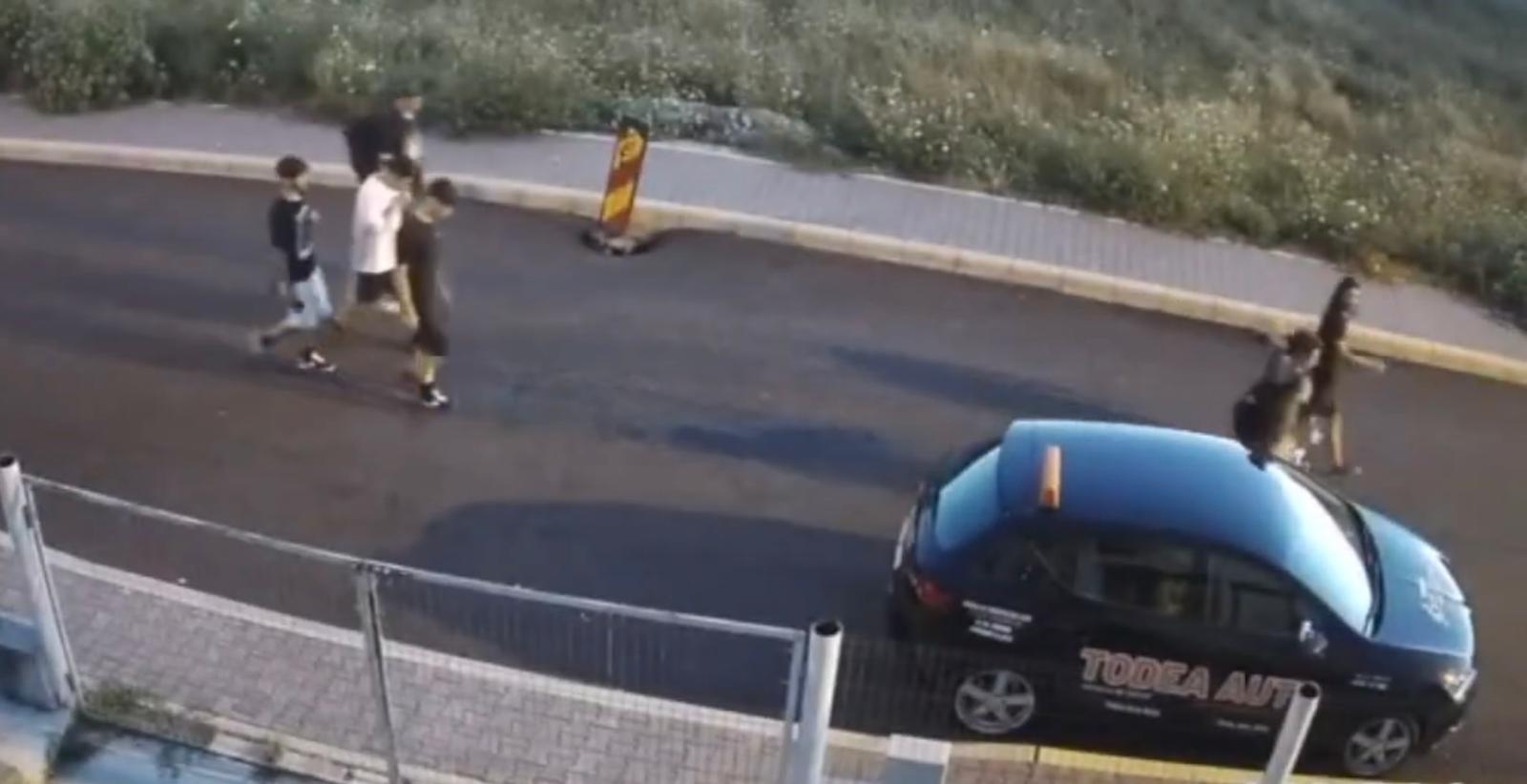 Un prieten din aceeași gașcă reacționează la gestul băiatului și îl mustreză cu o palmă peste ceafă, însă își continuă drumul alături de grupul de adolescenți.
