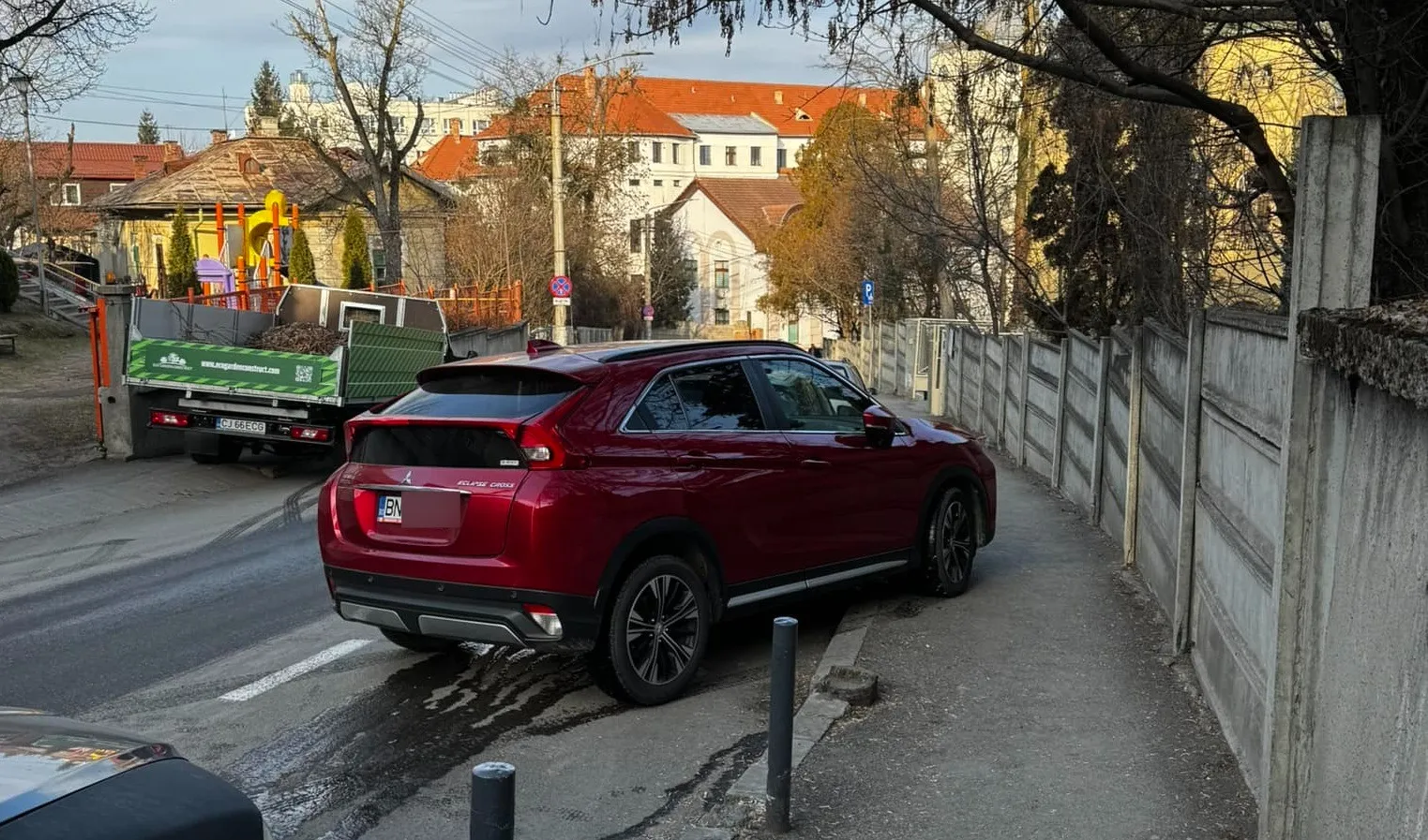 Un astfel de moment a fost surprins de un pieton, atunci când, un șofer cu numere de Bistrița-Năsăud, a parcat mașina jumătate pe trotuar iar cealaltă pe drum, pe strada Louis Pasteur din Cluj-Napoca.