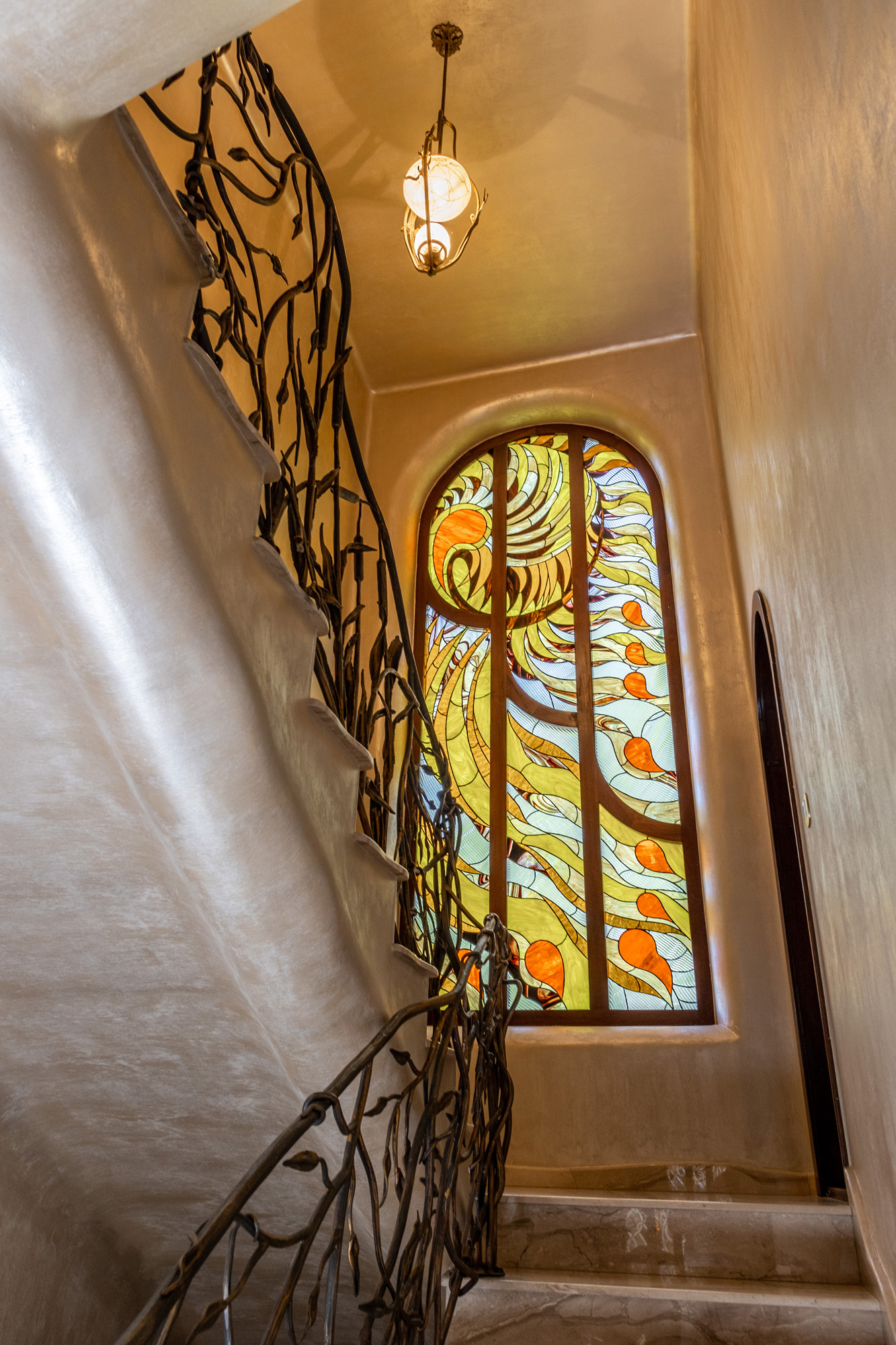 Ușa de la intrare, la fel ca tâmplăria din întreaga locuință, este din lemn Larice siberian și vitralii. Vitraliile care se regăsesc in întreaga locuință sunt realizate manual în tehnica Tiffany. În holul de la intrare ne întâmpină tavanul in forma de vortex.