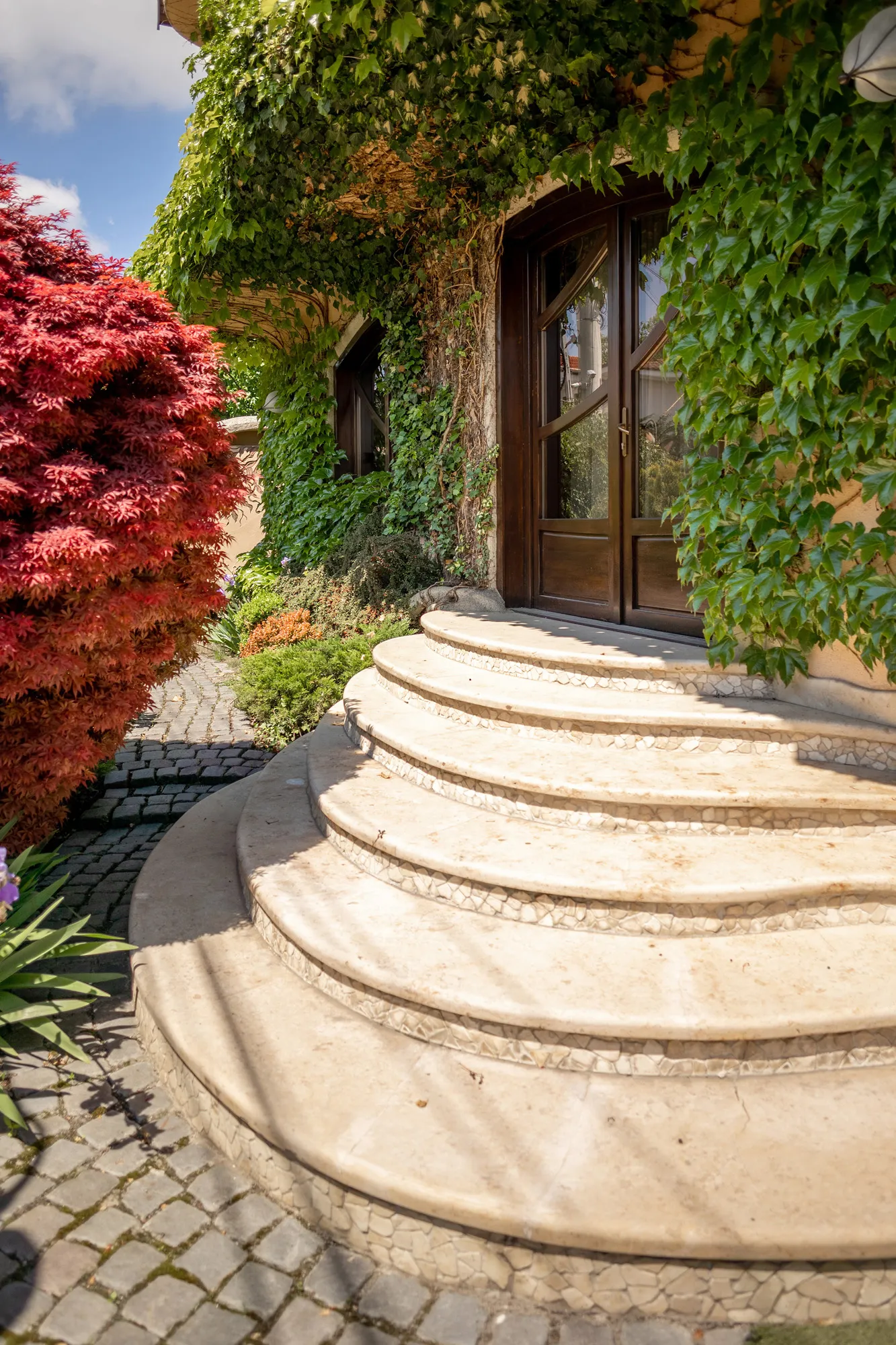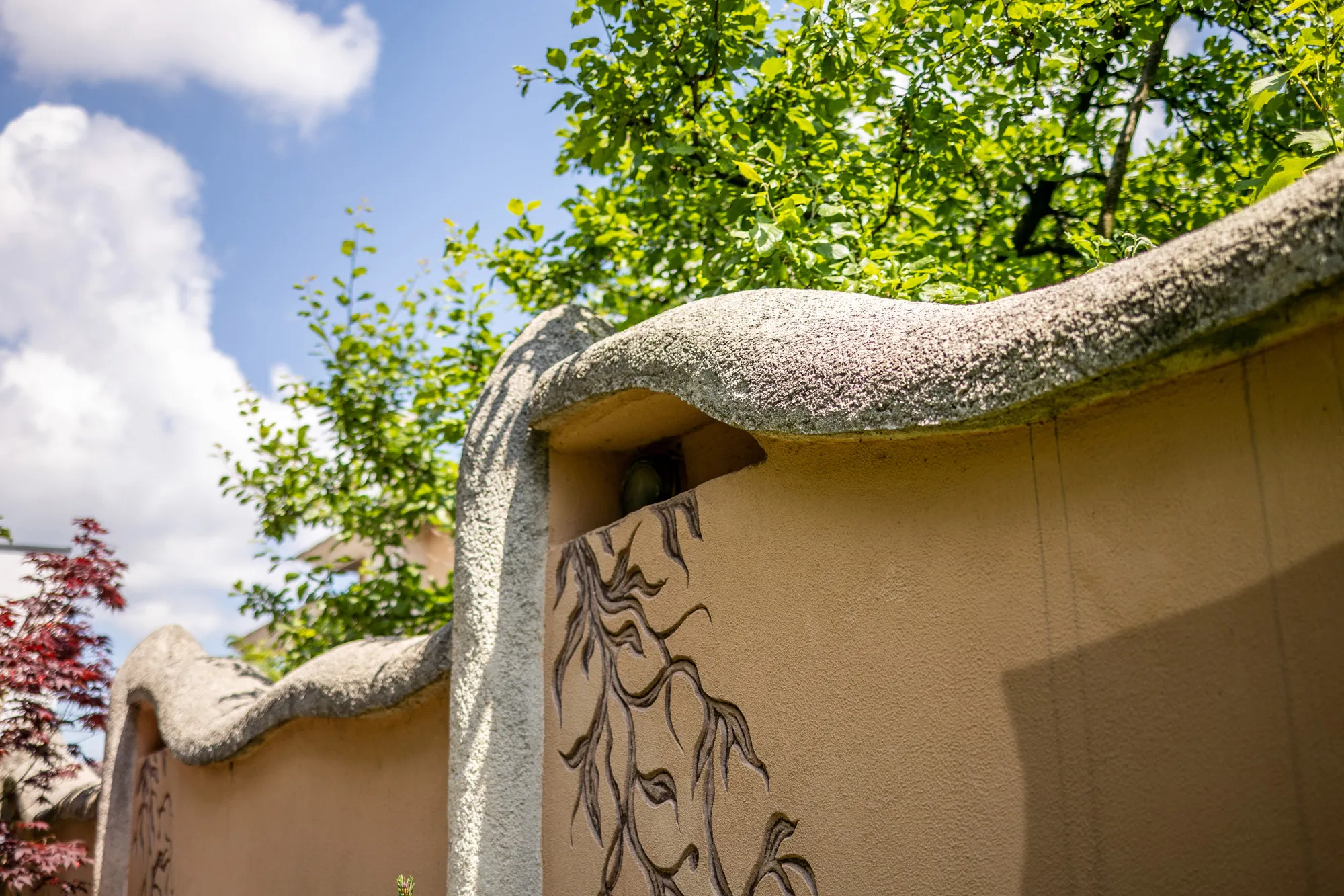 Soclul casei este sculptat manual și finisat cu praf de piatră care ne duc cu gândul la rădăcini de mangrove.
