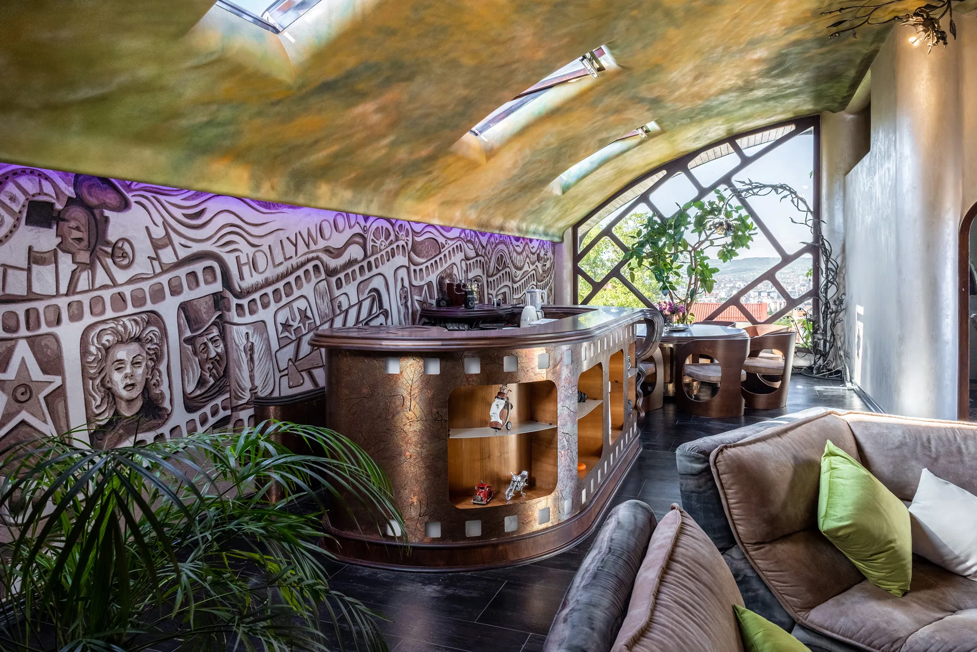Mansarda este un open space compus din trei zone funcțional distincte delimitate de un stâlp central decorat în stil Art nouveau care are la bază un tablou rotund din mozaic placat cu aur de 24 karate lucrat manual, care susține tavanul pictat manual in stil Art nouveau in culori pastelate”, descriu agenții imobiliari vila de pe un site internațional.