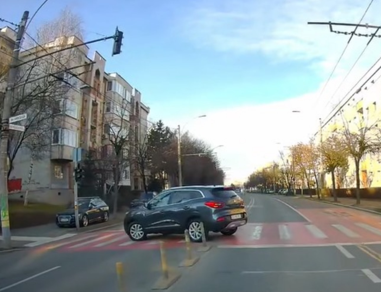 Credeți că asta l-a oprit pe șoferul de Renault din Cluj? Nici vorbă, el a trecut de stâlpii amplasați exact pentru a împiedica virajul, a întors pe trecerea de pietoni (altă ilegalitate flagrantă) și a trecut pe sensul opus, după cum și-a dorit.