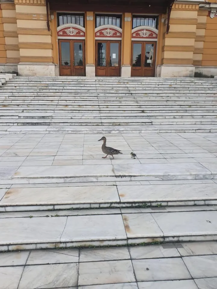 O rață sălbatică și un boboc au fost surprinși trecând liniștiți prin fața Teatrului Național. Natura a prins viață la Cluj și așa ar trebui să rămână.