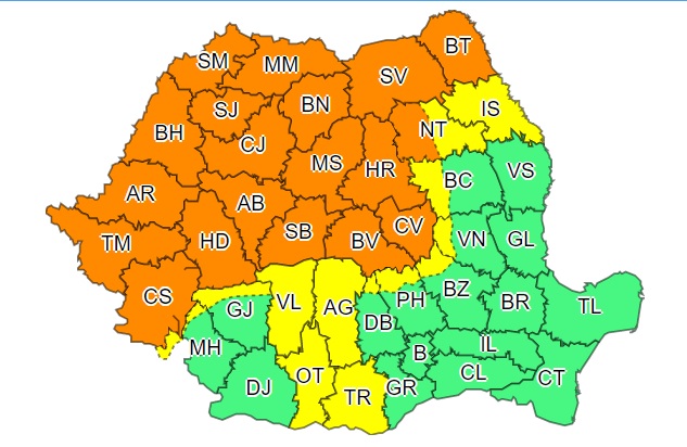 Meteorologii de la ANM au emis o nouă serie de avertsimente de tip cod galben și portocaliu de vreme rea, care afectează mai bine de jumătate din țară.