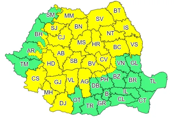 Meteorologii de la ANM au emis o nouă serie de avertismente de tip cod galben de vreme rea pentru aproape toată țara.