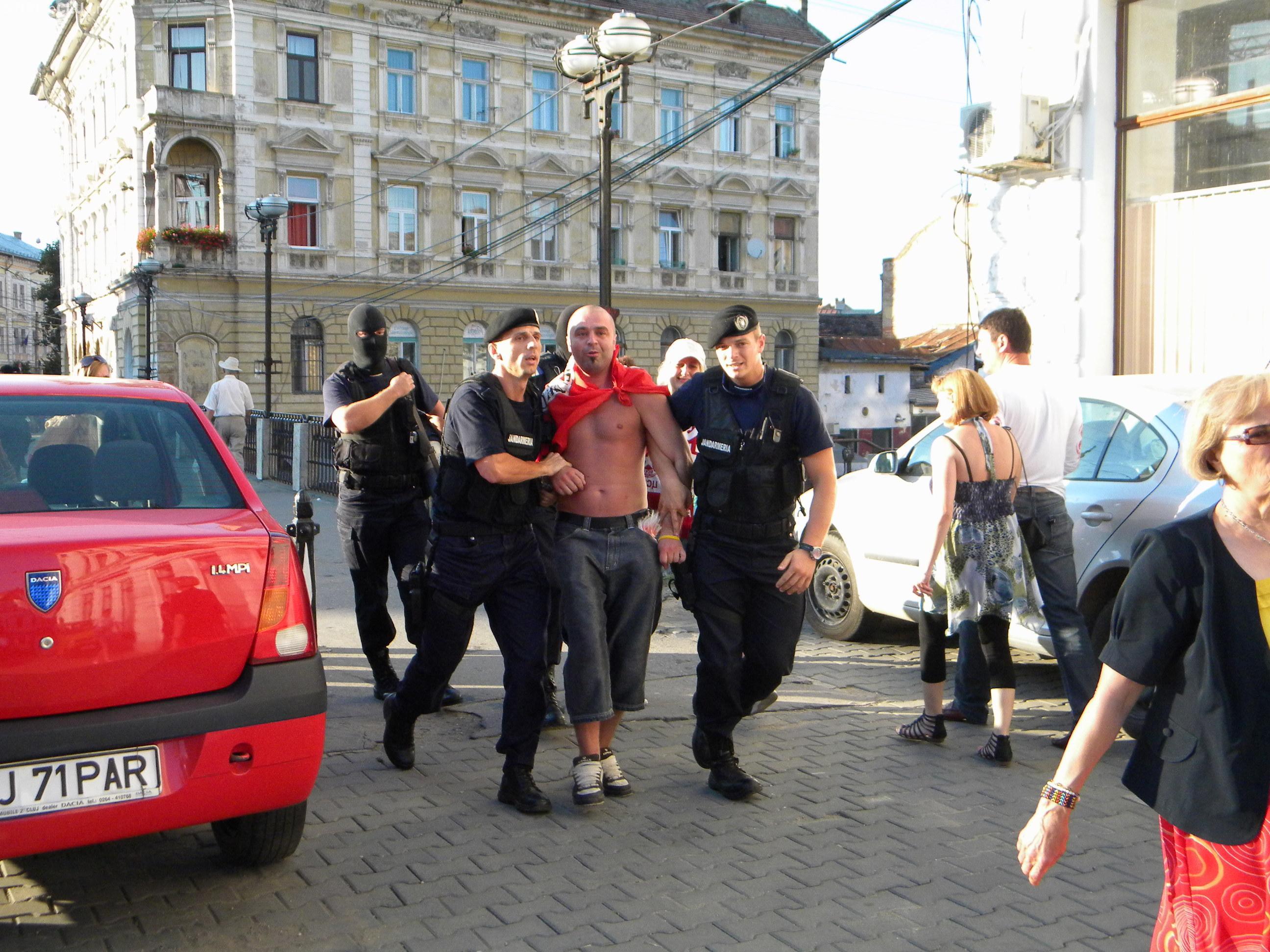 Imaginile au fost postate pe site-ul youtube.com si au fost surprinse in centrul Clujului, in momentul in care mai multi fani au fost implicati intr-un scandal cu fortele de ordine.