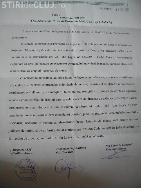 Inspectorul sef al ITM Cluj, Emilian Rosca, a declarat pentru Stiri de Cluj ca nu cunoaste plangerea depusa de angajatul Nokia, dar ca "in conformitate cu legislatia acesta nu poate fi trimis in concediu fara salariu de pe o zi pe alta si ca, daca nu sunt comenzi, oamenii trebuie trimisi in somaj tehnic".