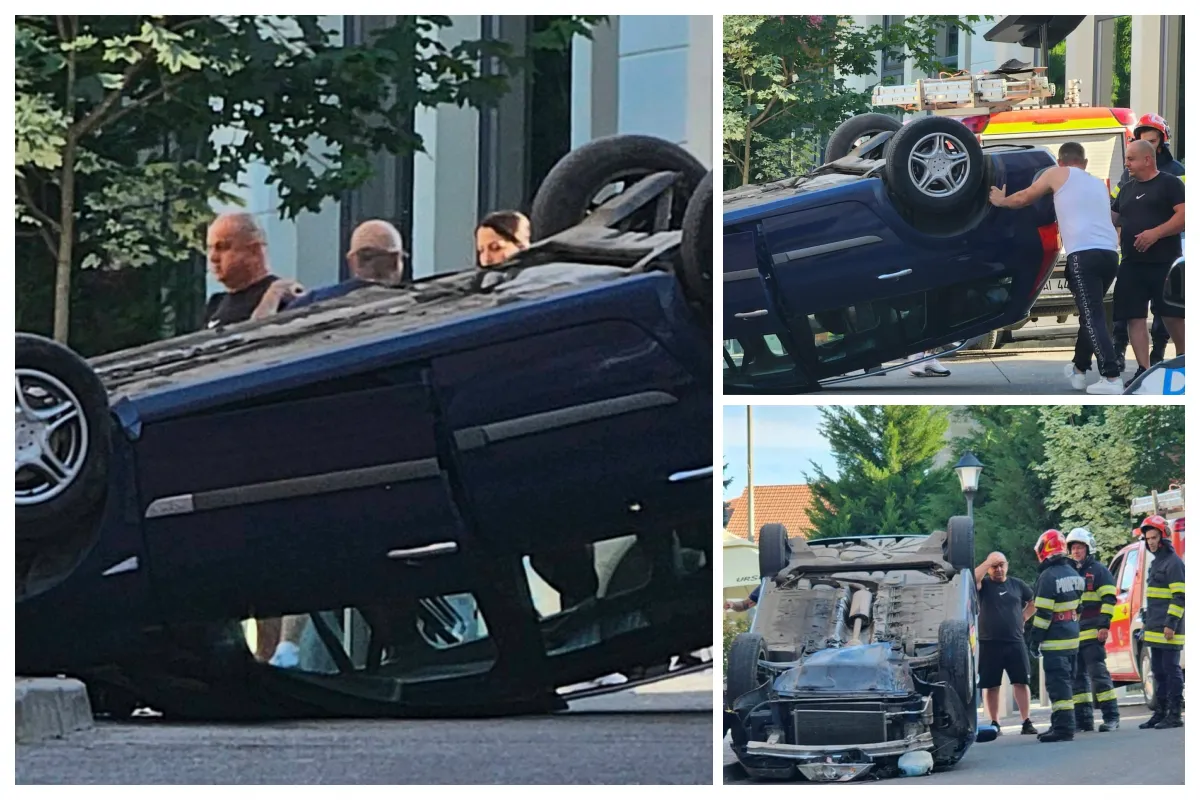 Un accident spectaculos s-a petrecut marți, în jurul orei 18:00, pe strada Parcului din centrul municipiului Dej. Un autoturism s-a răsturnat, ajungând cu roțile în sus.