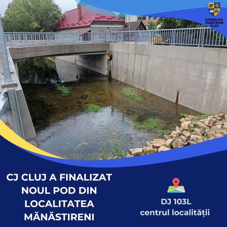 Consiliul Județean Cluj a finalizat lucrările de construire a noului pod rutier din localitatea Mănăstireni, situat pe drumul județean DJ 103L, la kilometrul 0+000. Investiția a fost realizată prin Programul Național de Investiții „Anghel Saligny” și din fonduri proprii ale județului.