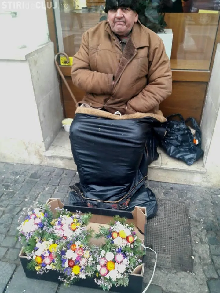 Deși există numeroase persoane care recurg la cerșetorie, bătrânelul preferă să muncească, stând ore în șir în zona Teatrului Național din Cluj-Napoca și își vinde buchetele de flori, uscate și aranjate chiar de el.