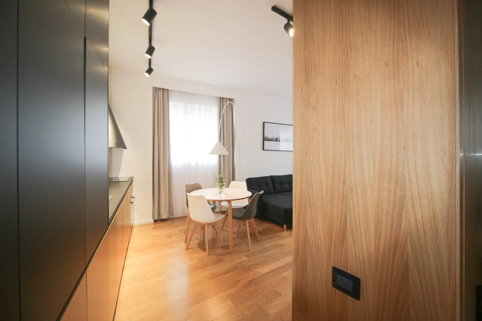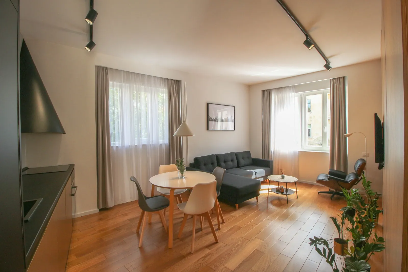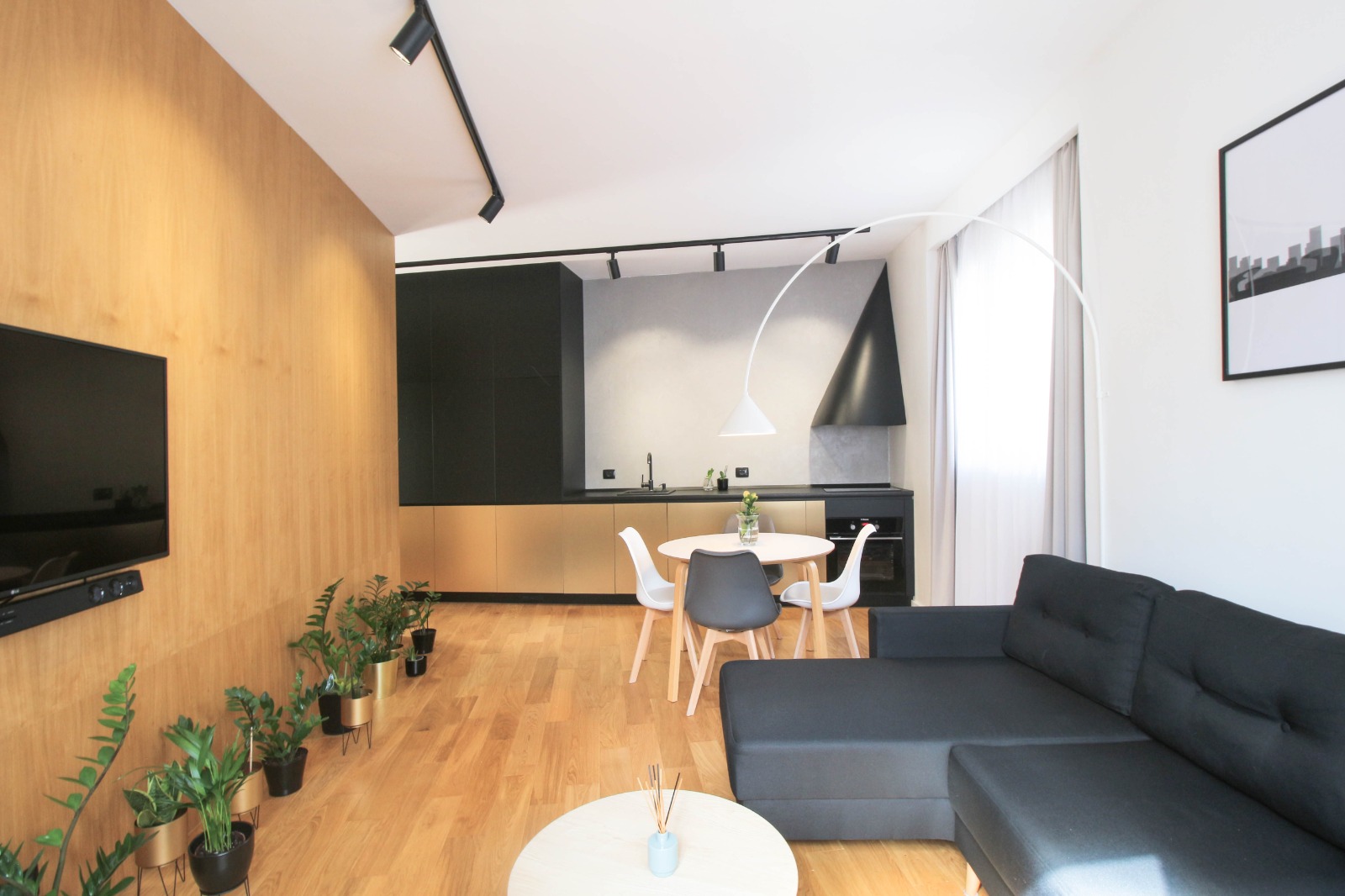 Apartamentul este dotat, utilat și mobilat pentru condiții premium: încălzire în pardoseală (centrală proprie), aer condiționat, jaluzele black-out în dormitor, TV + soundbar + subwoofer, electrocasnice încorporate în mobilier (mașină de spălat rufe cu uscător, mașină de spălat vase, plită și cuptor electrice, combină frigorifică).