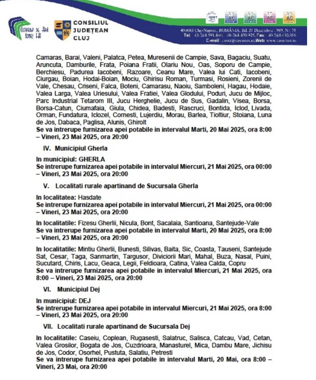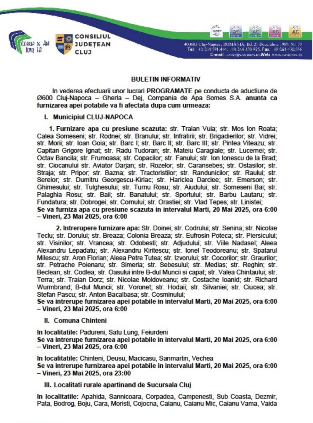 Zeci de mii de locuitori din municipiile Cluj-Napoca, Gherla, Dej, precum și din numeroase localități din județul Cluj, vor fi afectați fie prin întreruperea completă a apei, fie prin furnizarea acesteia la presiune foarte scăzută, insuficientă pentru uzul casnic obișnuit.