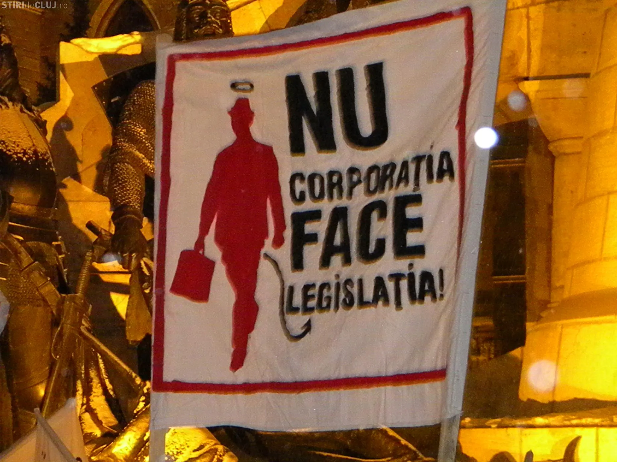 Asa se face ca lozincile: "Eu sunt pui de dizident, vreau sa folosesc torent", "Toata lumea stie, ACTA este SIE", "Jos ACTA!" si "Va rugam sa ne scuzati, ne simtim supravegheati" s-au intretaiat cu cele "Jos Basescu", "Va rugam sa ne scuzati, nu producem cat furati" si "Romania nu mai fi, colonie FMI", "Afara, afara cu FMI din tara".