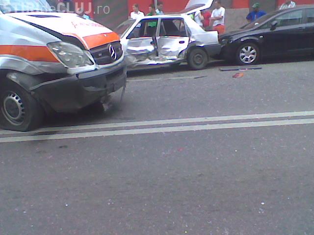 O ambulanta SMURD a fost lovita de un taximetru in intersectia Piata Unirii cu strada Regele Ferdinand, din Cluj-Napoca. Autospeciala se se indrepta spre spital pentru a lua un pacient. Trei persoane din taximetru au fost ranite grav.