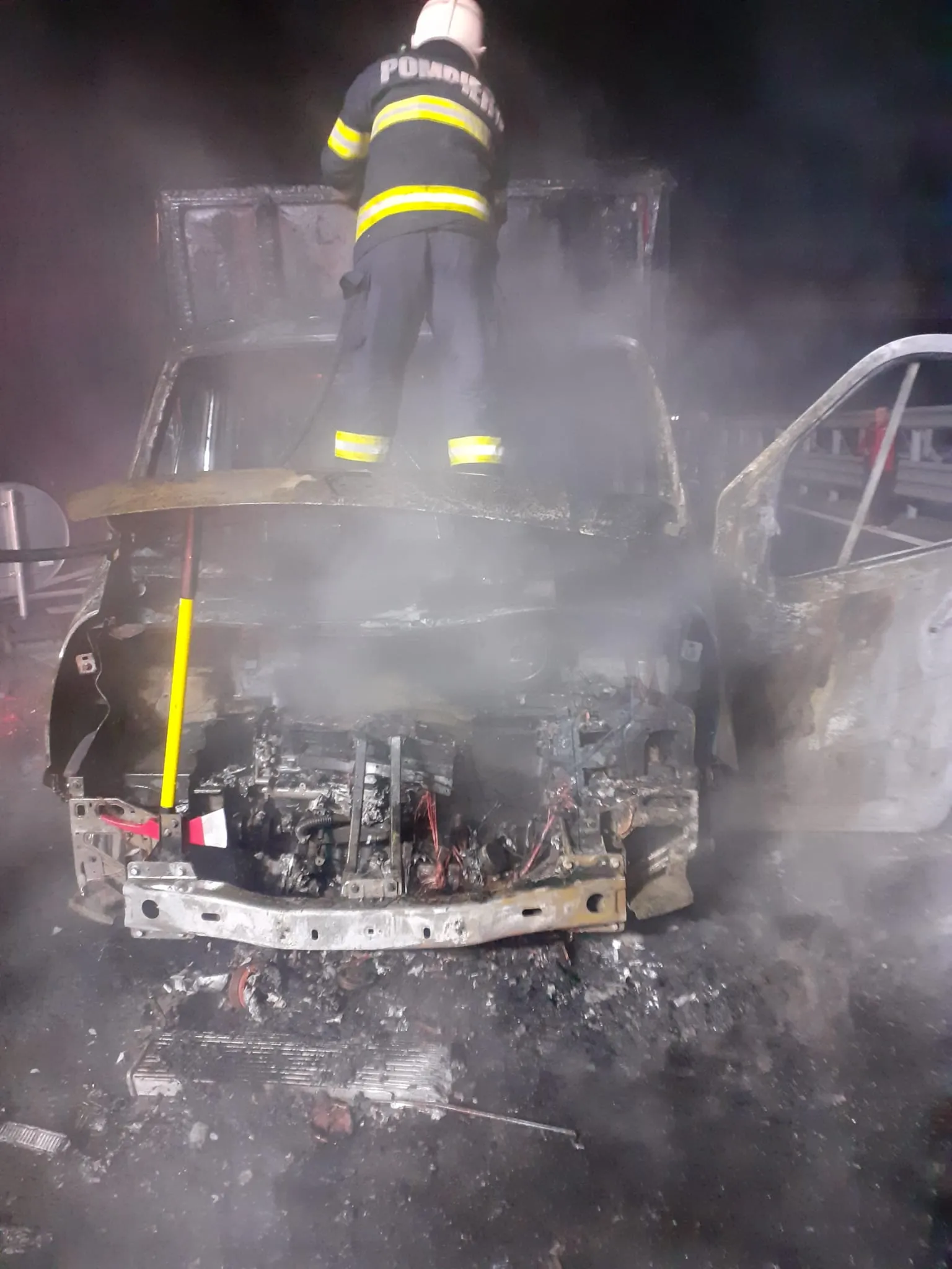 Pompierii de la Detașamentul Turda au intervenit noaptea trecută pentru a stinge un incendiu care a distrus o autoutilitară aflată pe Autostrada A3. Apelul de urgență a venit la ora 01:09, iar la locul solicitării s-a deplasat o autospecială cu apă și spumă.