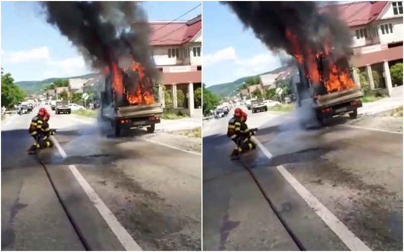VIDEO - O autoutilitară a luat foc în centrul orașului Dej. Pompierii și-au făcut datoria ca la carte