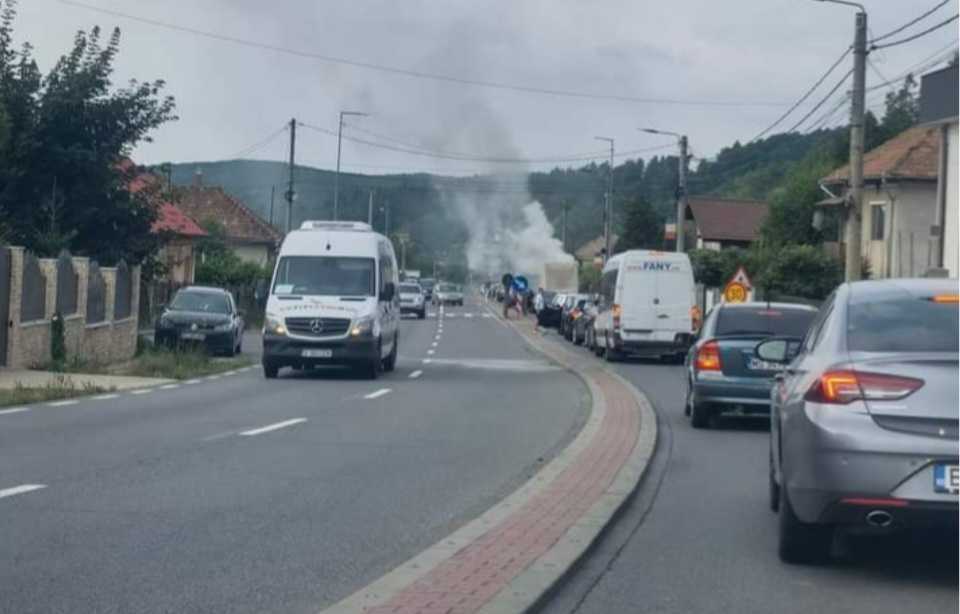 O autoutilitară a luat foc la coborâre din Feleacu! Traficul în zonă afectat, clujenii au încercat să stingă incendiul