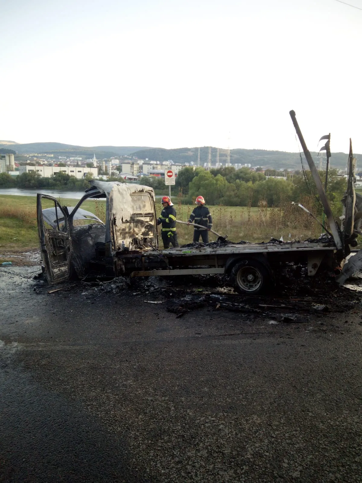 O autoutilitară a luat foc, marți seara, la barajul din localitatea Florești.