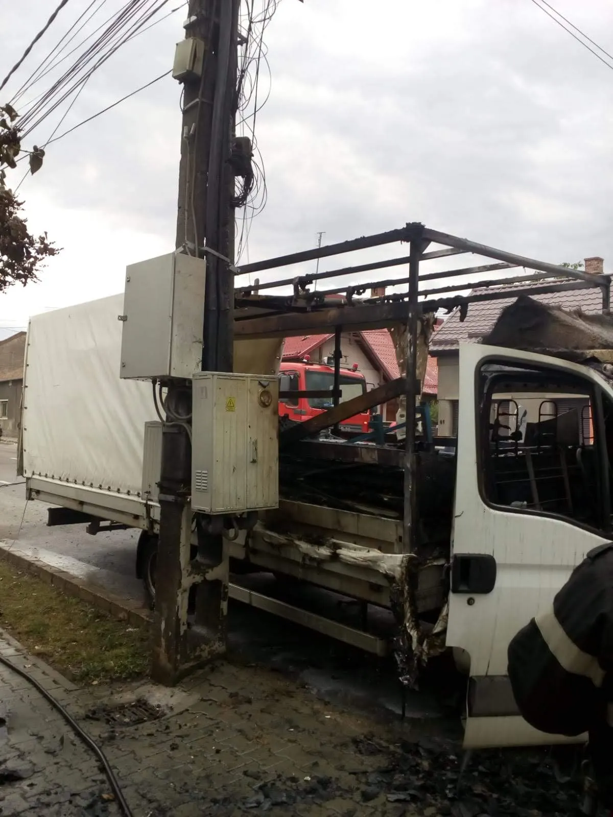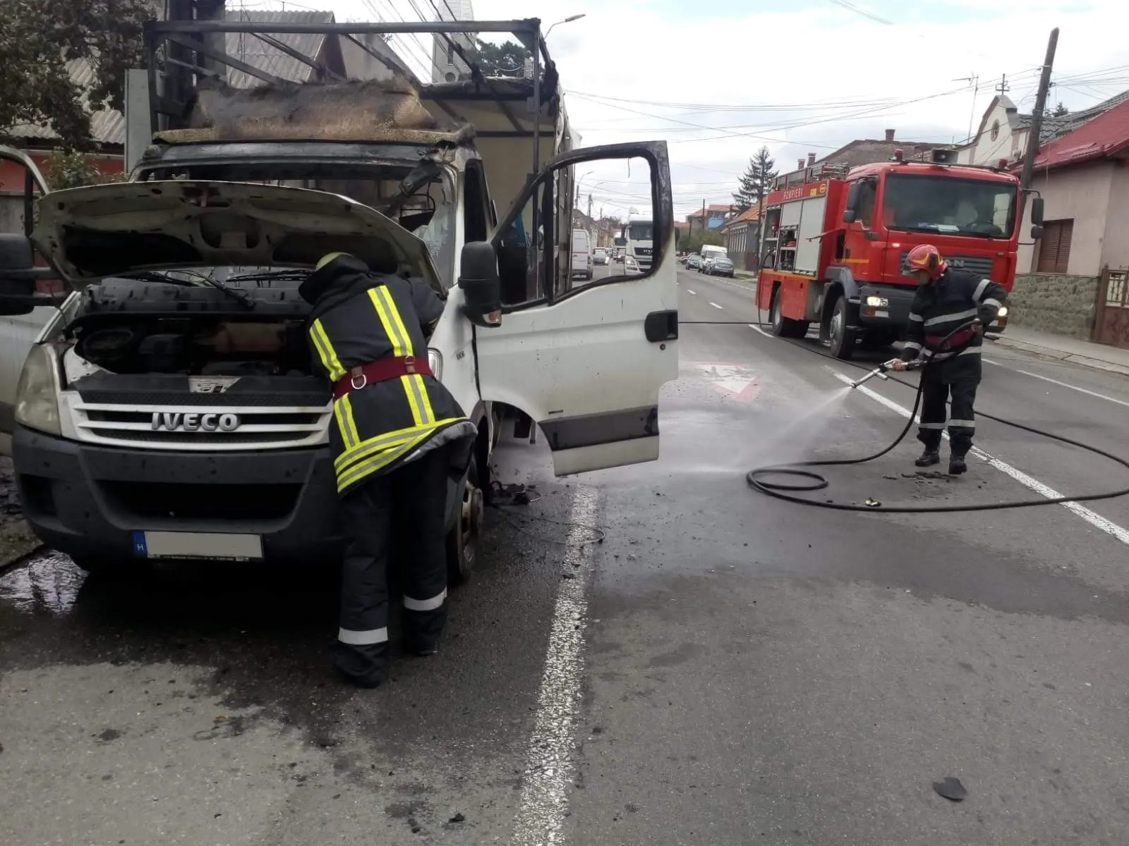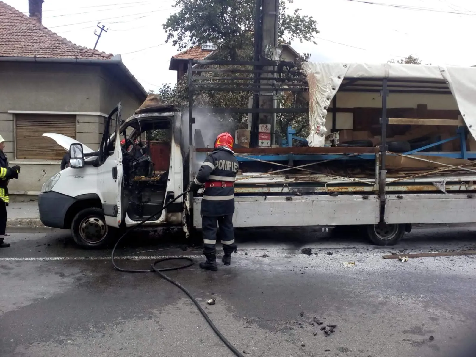 O autospecială de stins incendii a intervenit pentru a lichida flăcările ce au cuprins o autoutilitară pe strada Horea din orașul Huedin, izbucnite în jurul orei 13.50.