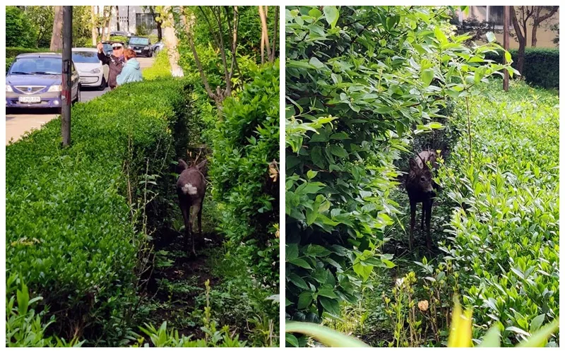 ”Poza dimineții! Un căprior pe aleile dintre blocuri, în capăt de Gheorgheni, zona Albac, speriat și dezorientat, încercând să se ascundă după gardul viu.