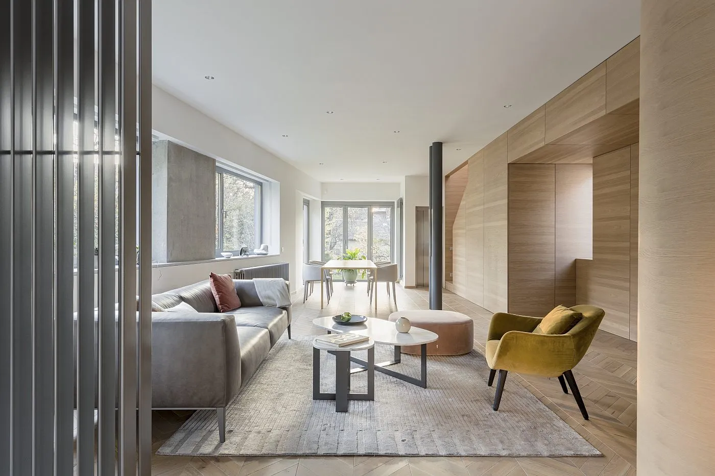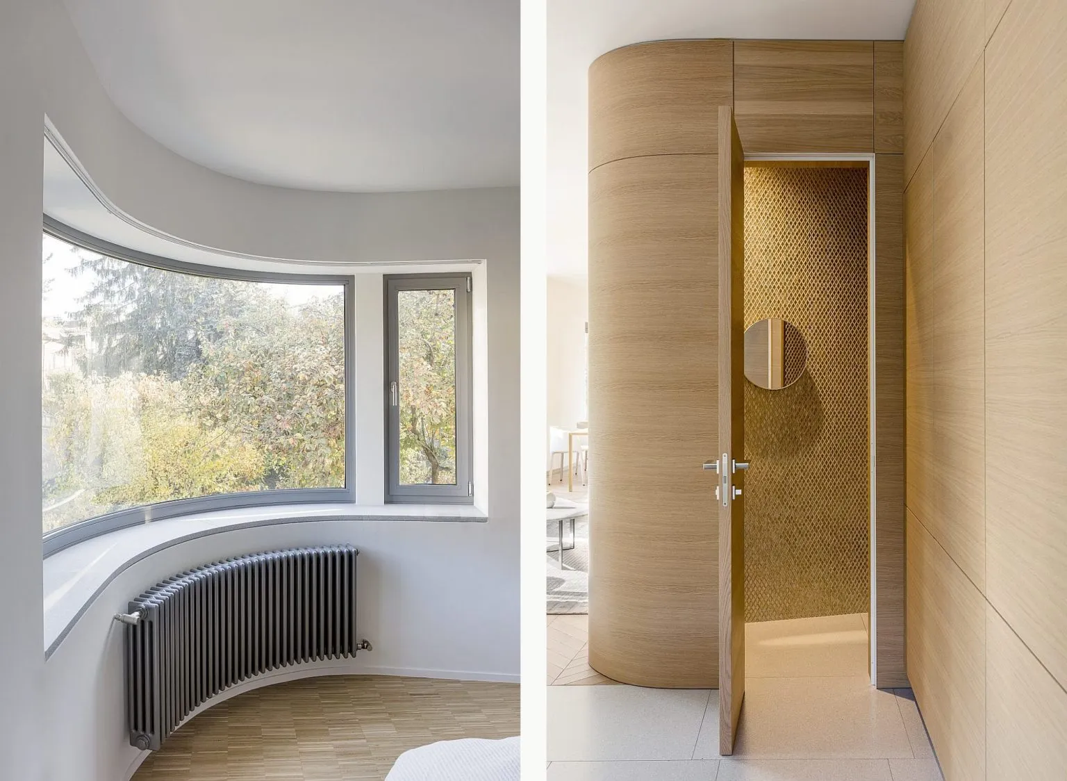 Clădirea a avut nevoie de intervenții radicale pentru a putea fi locuită din nou, iar arhitectul a ținut cont de colțul curbat dinspre latura de sud-est. După reabilitare, din subsol a dispărut garajul. Pentru relaxare, imobilul dispune și de o curte cu gazon. La parter există bucătăria și camera de zi, cu acces direct către peluză și grădină. La etajul 1, liftul și scara duc înspre două dormitoare, o baie și un dressing deschis, tratat ca un spațiu de locuit, și către o terasă acoperită, ce dă tot către grădină.