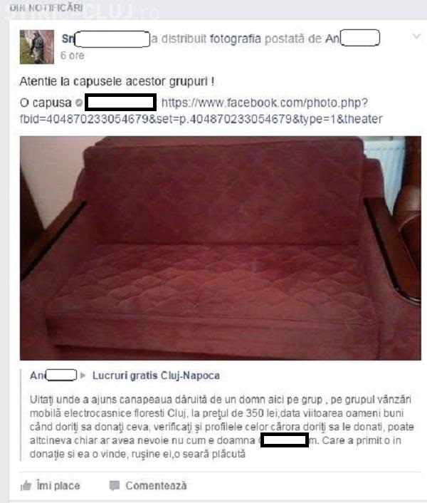 ”Uitați unde a ajuns canapeaua dăruită de un domn aici pe grup, pe grupul vânzări mobilă electrocasnice Florești Cluj, la prețul de 350 de lei. Data viitoare, oameni buni când doriți să donați ceva, verificați profilele celor cărora doriți să le donați, poate altcineva chiar ar avea nevoie nu cum e doamna care a primit-o în donație și ea o vinde. Rușine ei”, a scris un utilizator al grupului ”Lucruri gratis Cluj-Napoca”.